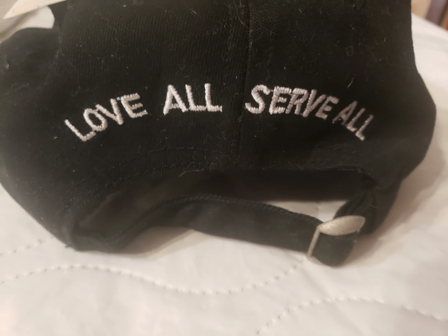 This is a black Hard Rock Cafe baseball cap from Lisbon. It features "Save the Planet" and "Love All Serve All" embroidery. It's a classic style cap.