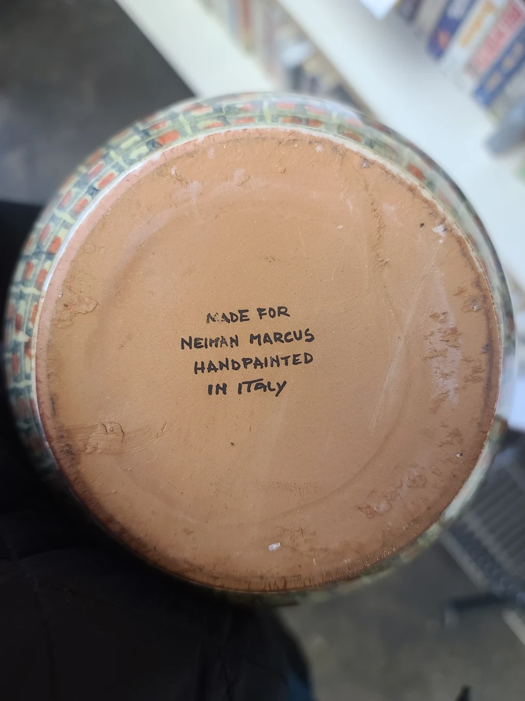 This decorative ceramic pitcher features a handpainted pear design on a yellow background with a brick pattern around the base. It has a ruffled rim and a decorative handle. Made in Italy for Neiman Marcus.