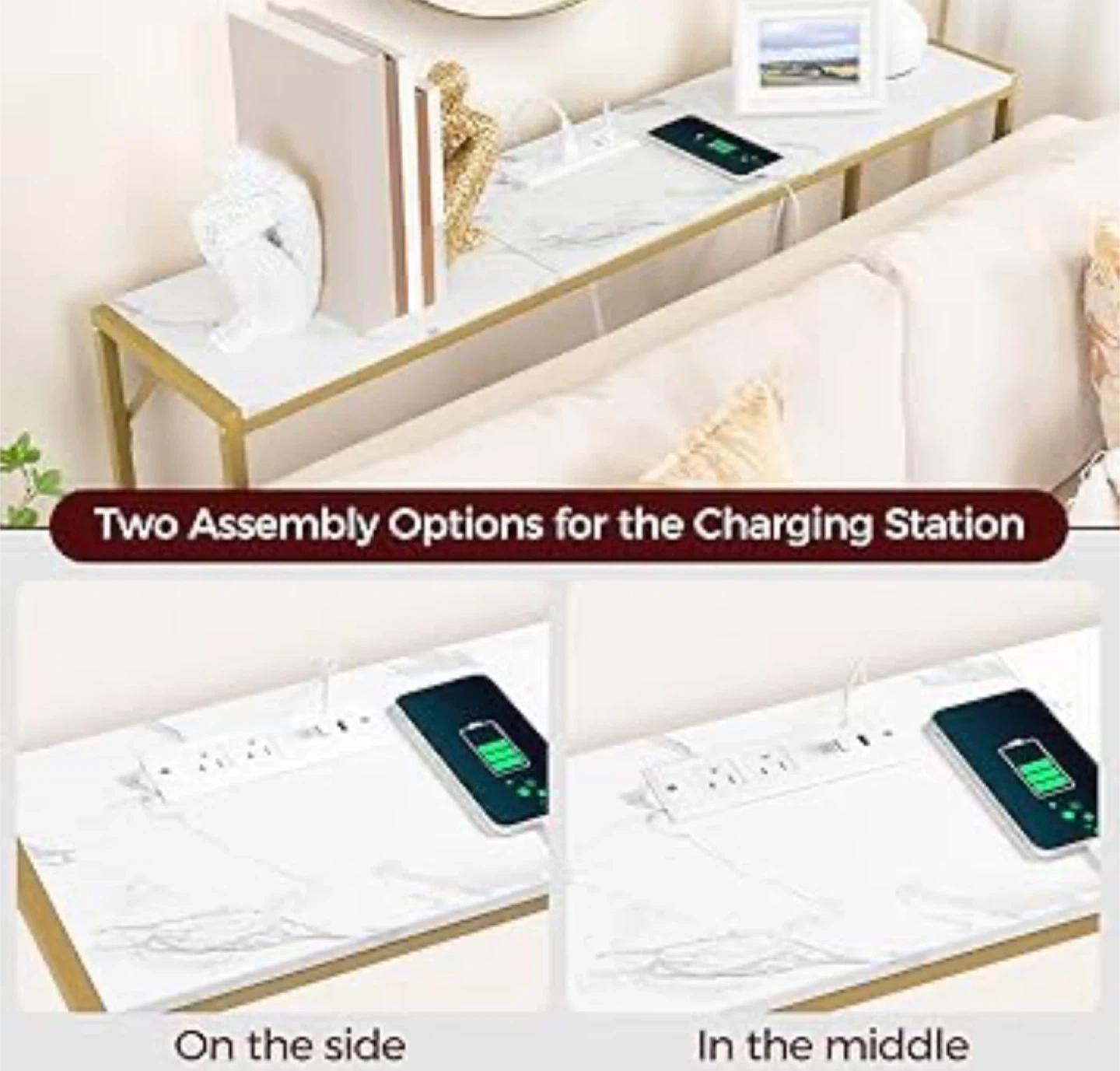 It includes a built-in charging station with outlets and USB ports, offering two assembly options for placement.