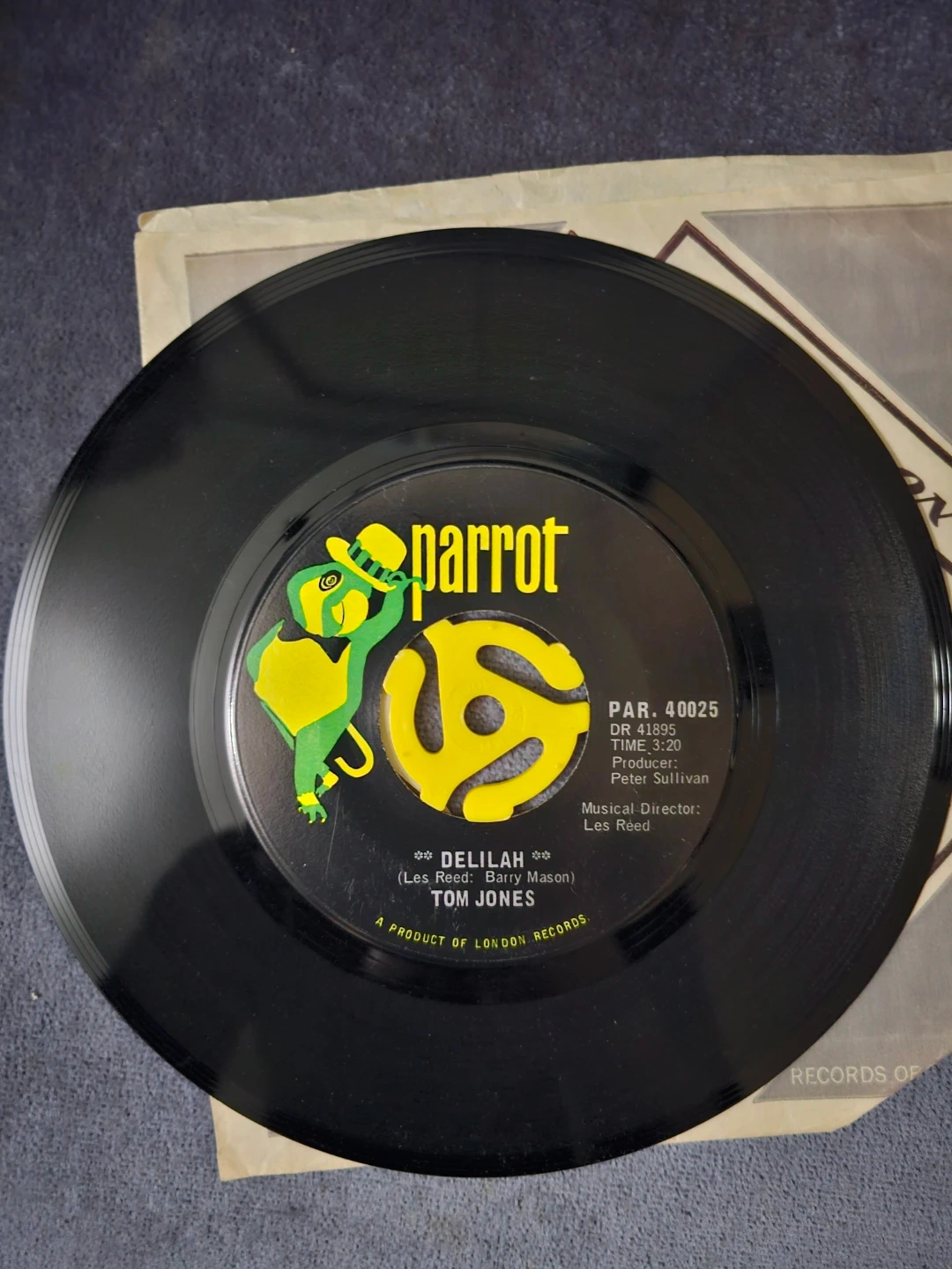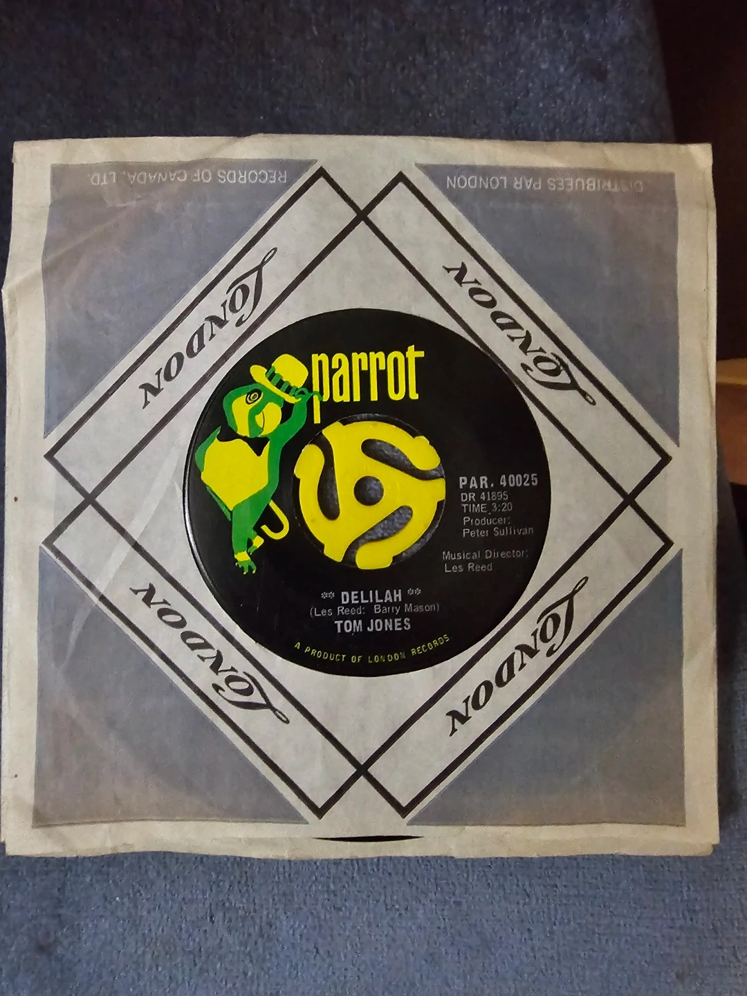 This is a 7-inch vinyl single featuring Tom Jones singing "Smile" and "Delilah". It's a product of London Records, released on the Parrot label. The record comes in its original paper sleeve.