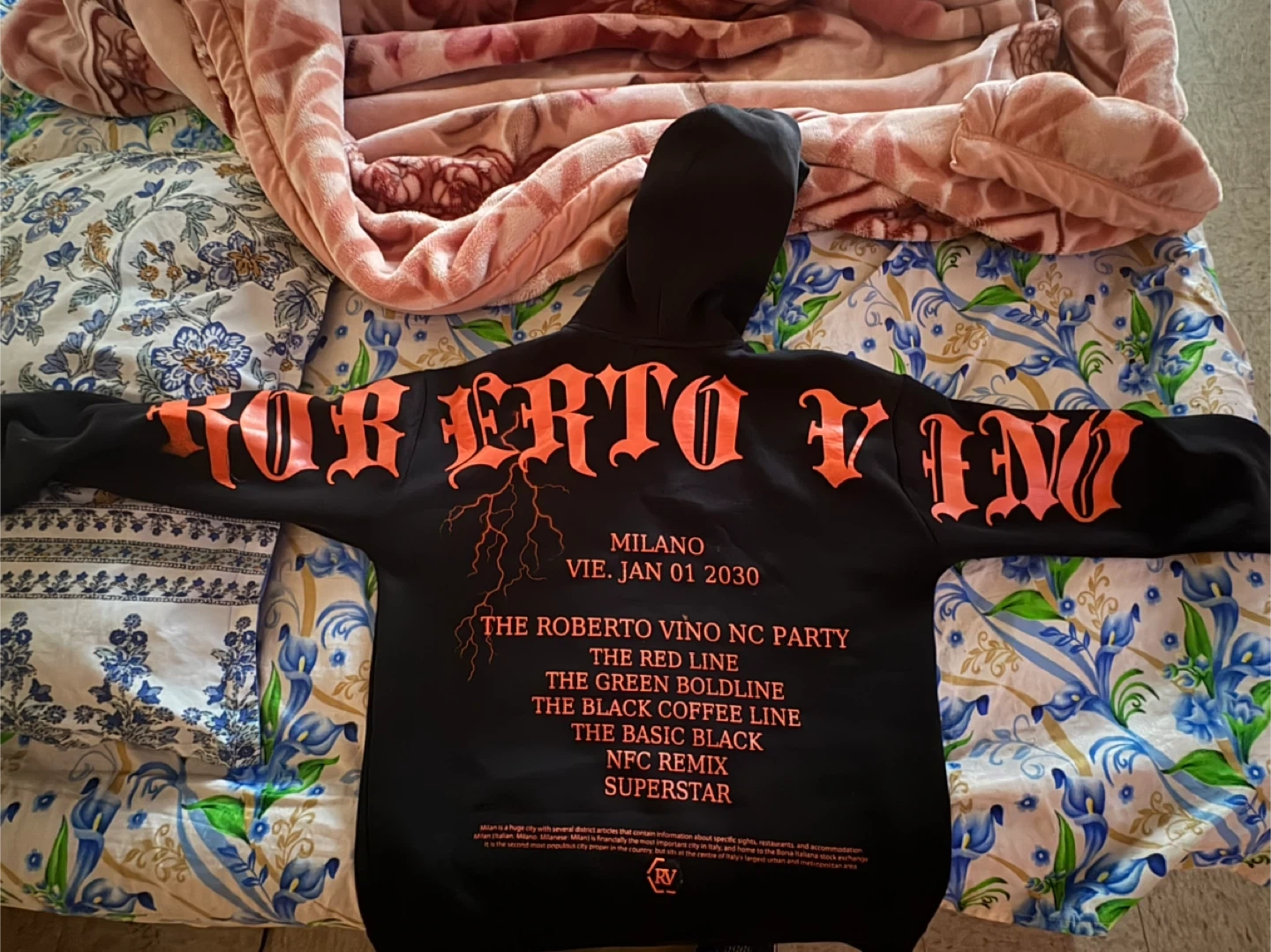Selling a Roberto Vino Milano hoodie in black, size small. The hoodie features a unique design on the back with the text "ROBERTO VINO" in orange lettering, along with "MILANO" and other text details. A cool and stylish piece!