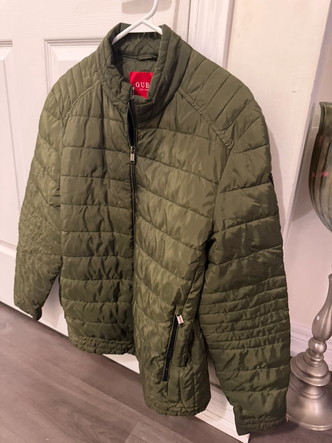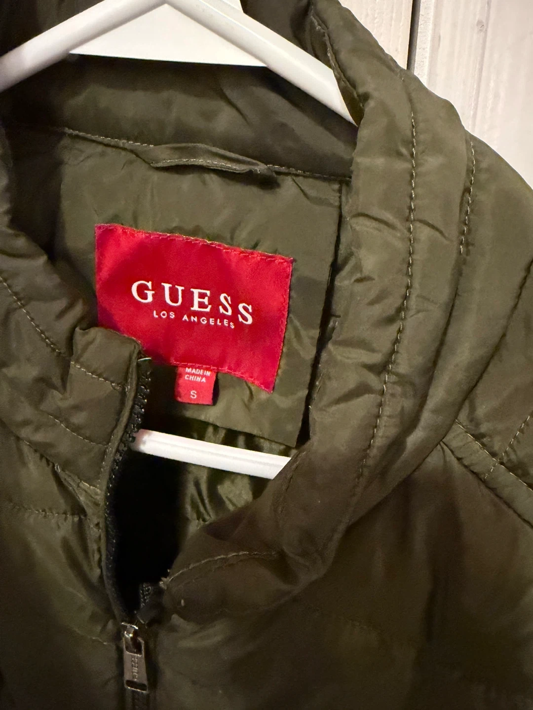 Selling a Guess puffer jacket in olive green. It's a size small and in great condition! Perfect for staying warm and stylish this winter.