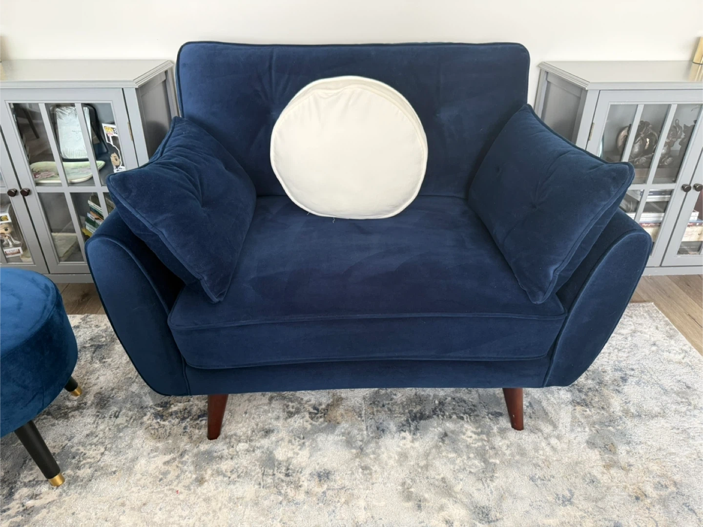 Comfortable dark blue velvet sofa with plush cushions. It comes with two accent pillows and wooden legs. This sofa offers a cozy seating experience for any living room.