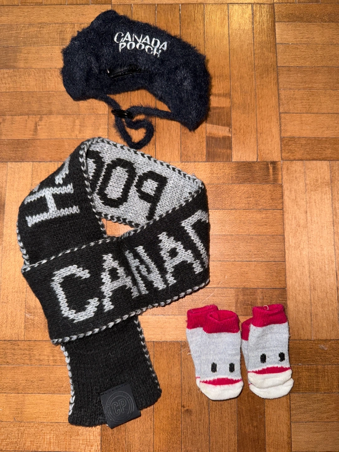 Size SMALL in hat and scarf. Socks are XS and come with grip under.