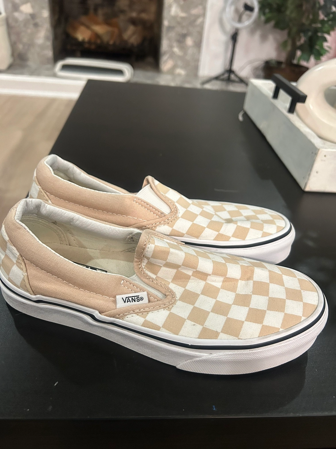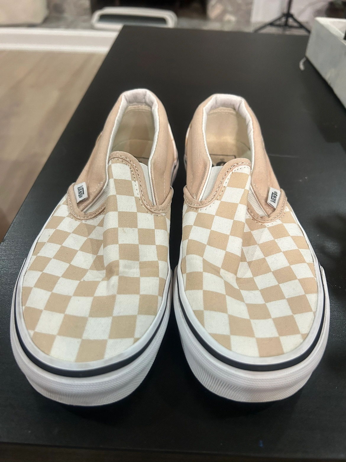 These shoes are in a light tan and white checkerboard pattern and feature a slip-on design with a white sole.
