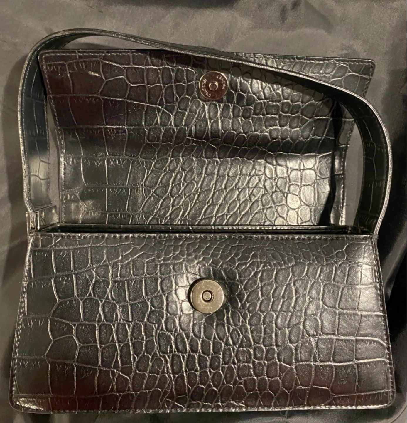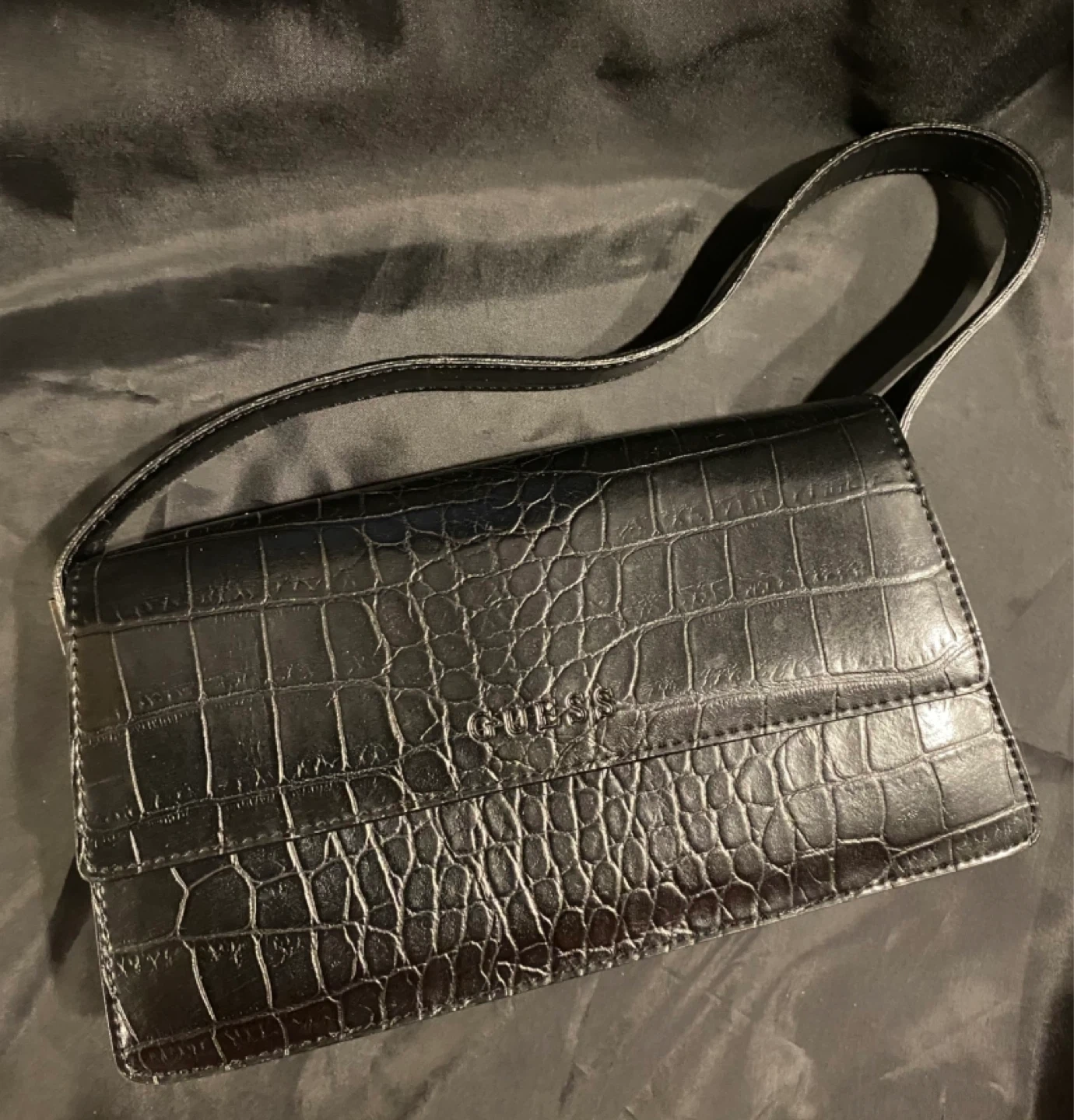This is a black Guess shoulder bag with a croc embossed leather finish. It features a magnetic snap closure.