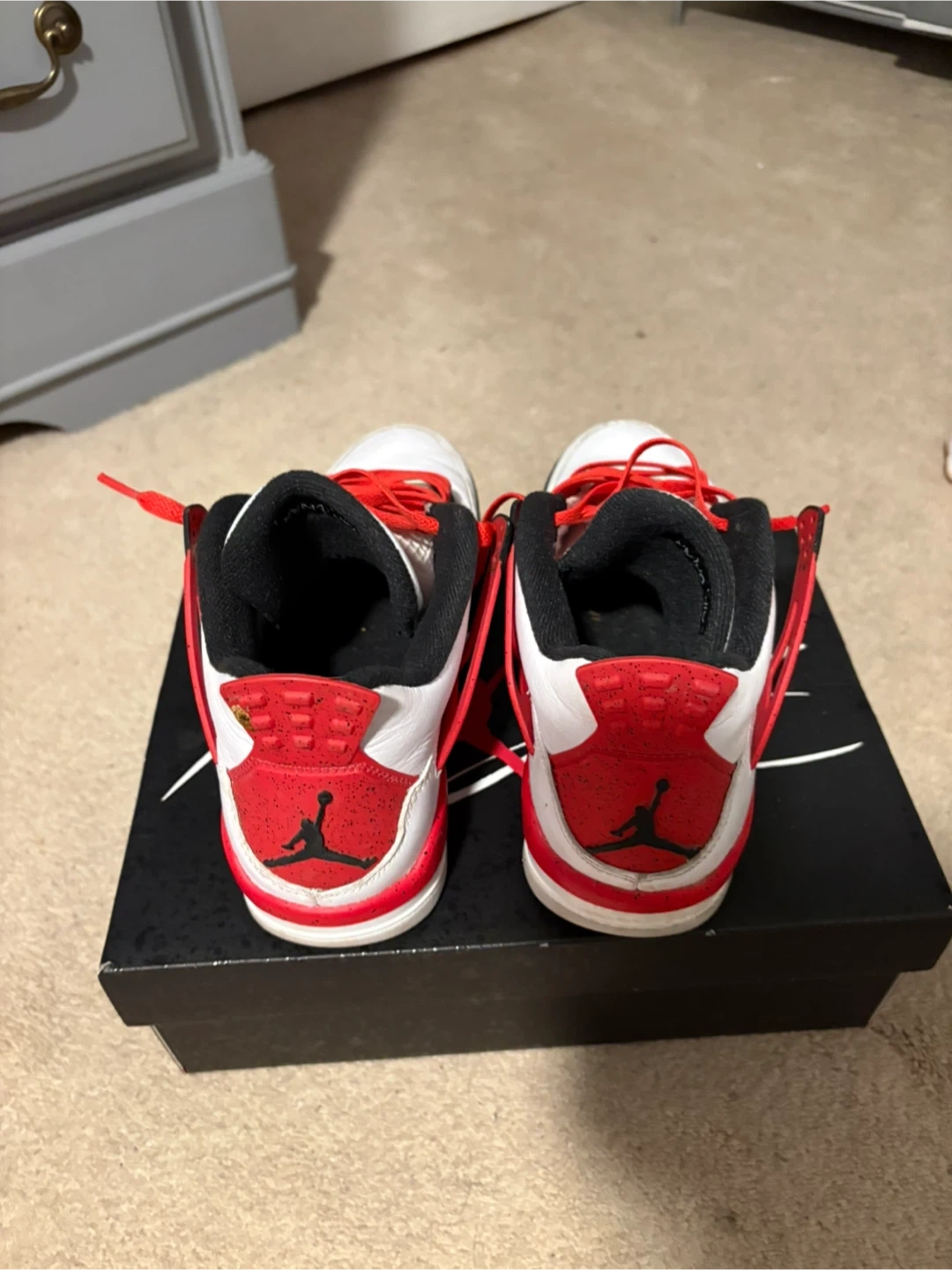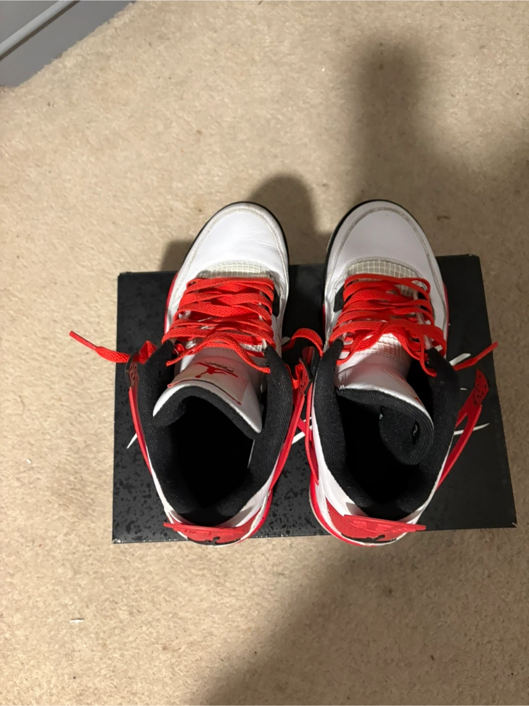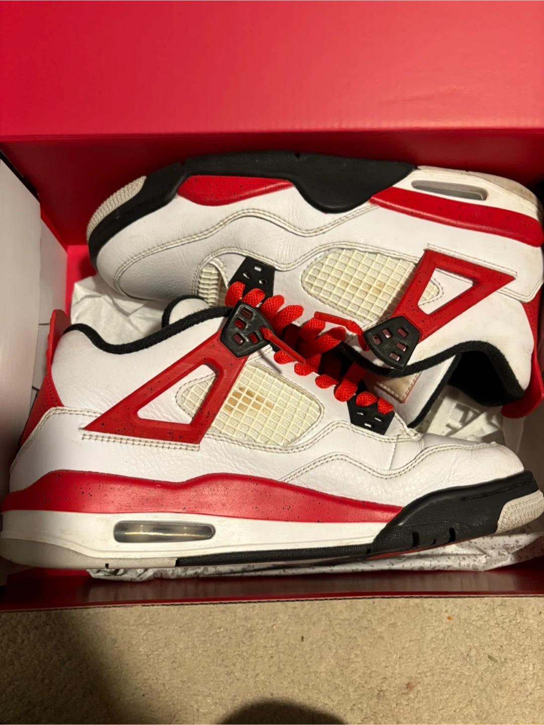 Selling a pair of Air Jordan 4 Retro (GS) sneakers in size 7Y. The colourway is White/Fire Red-Black. Comes with the original box!