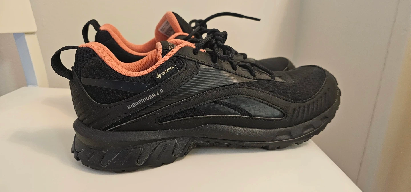 These are Reebok Ridgerider 6 Gtx women's trail running shoes in black and coral. They're a size 8.5 US. Gore-Tex waterproofing helps keep your feet dry.
