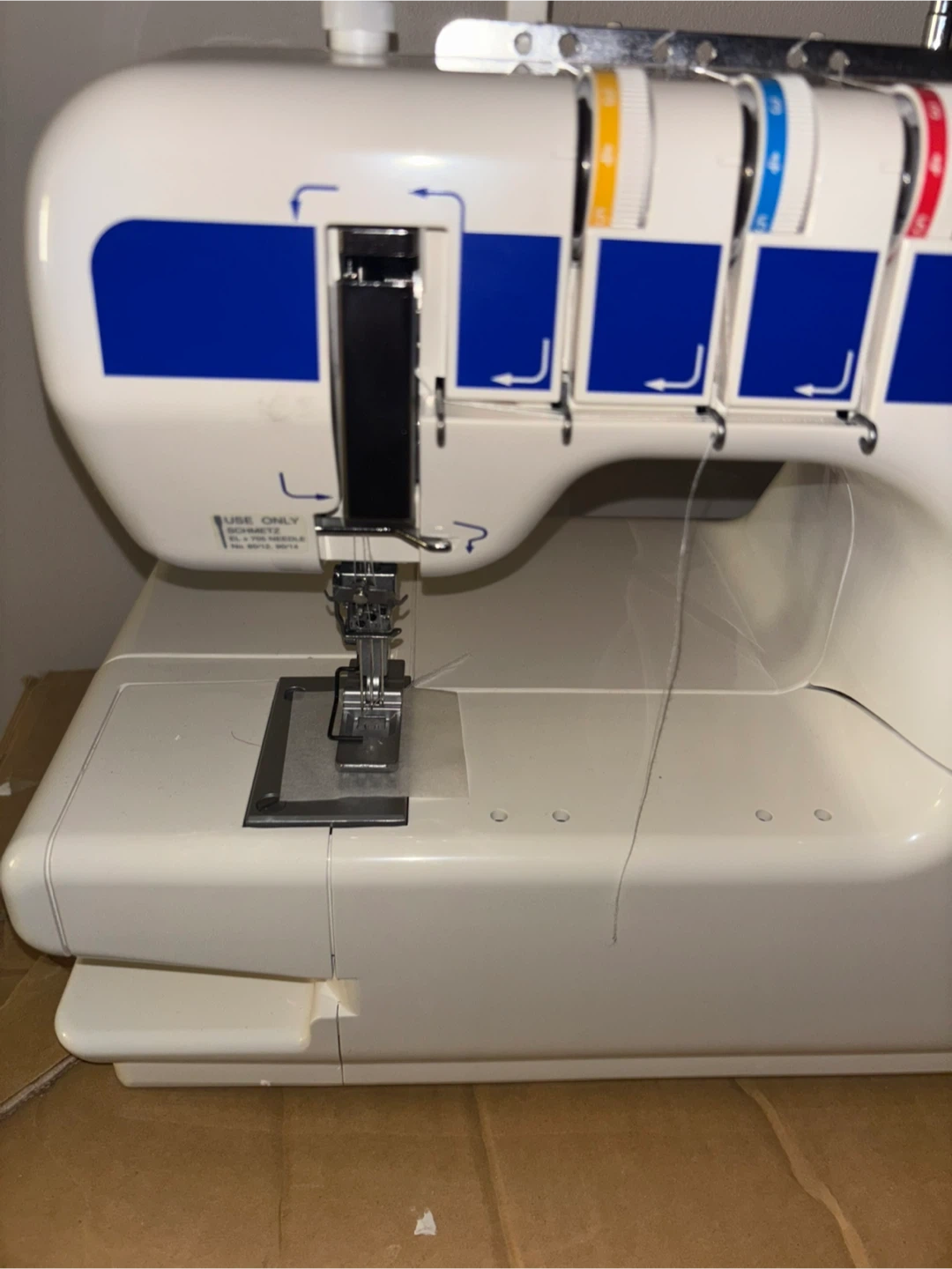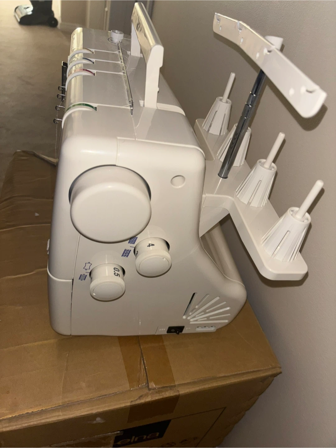 This is a white Elna 444 differential overlock sewing machine. It has multiple thread guides and tension dials for precise stitch control. This machine is useful for creating professional-looking seams on various fabrics.