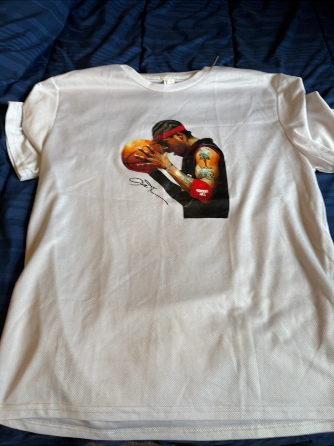White t-shirt featuring a graphic of a basketball player with a basketball. The shirt appears to be made of a polyester blend, commonly used for athletic wear. It's a comfortable, breathable option for casual wear or sports fans.