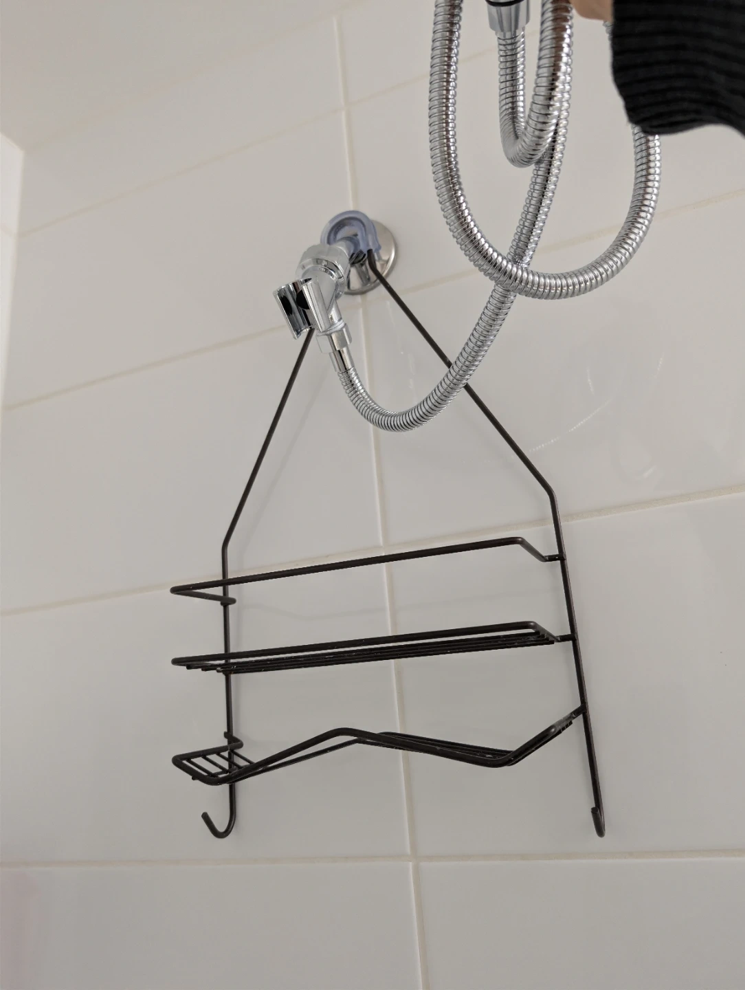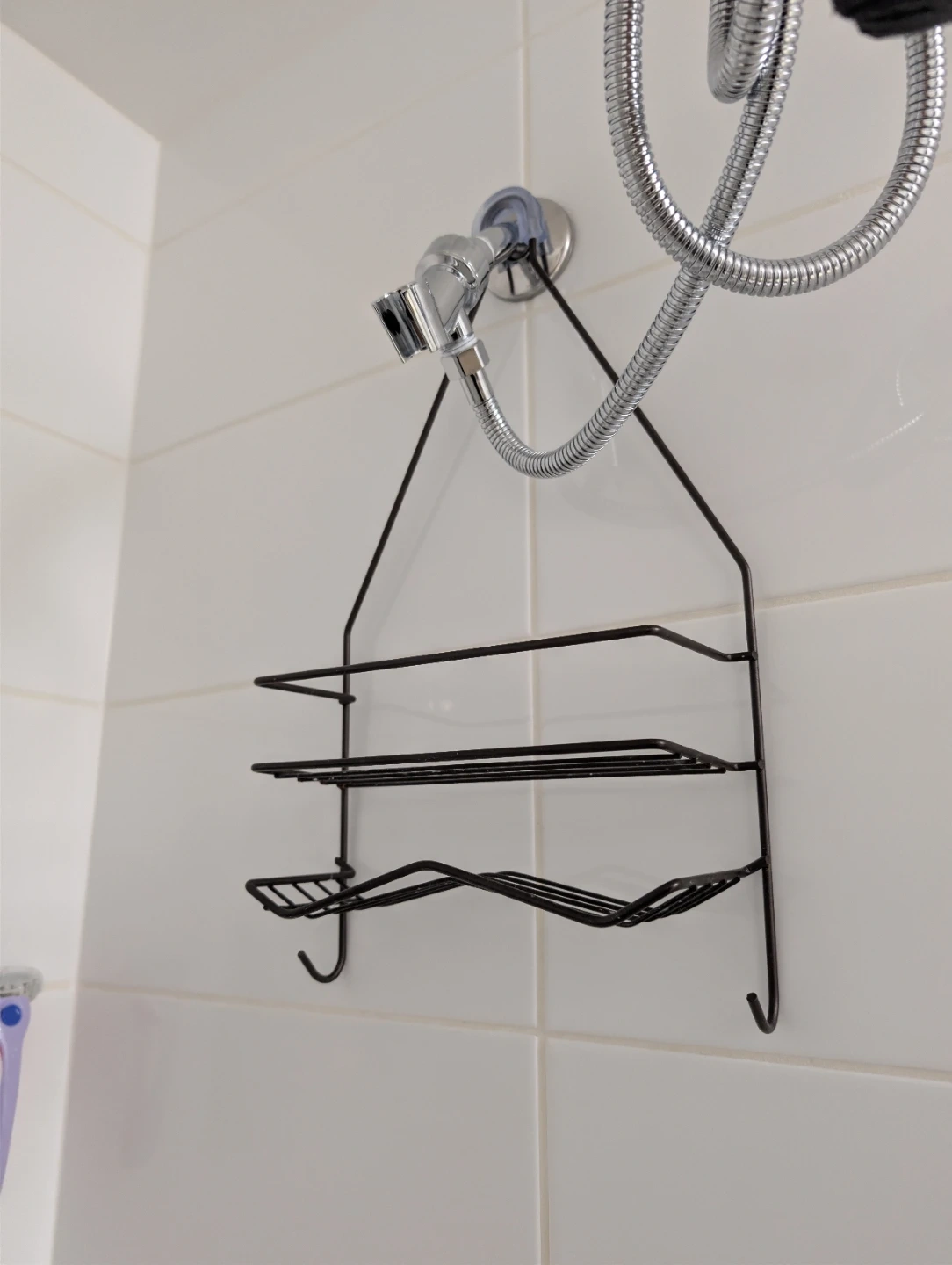 Black metal shower caddy with three hanging shelves. It has two hooks on the bottom for hanging other items. Perfect for organizing your shampoo and soap bottles in the shower!