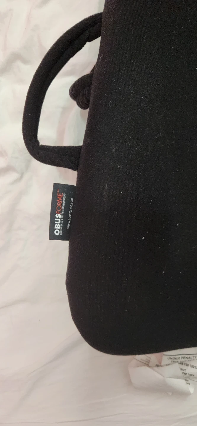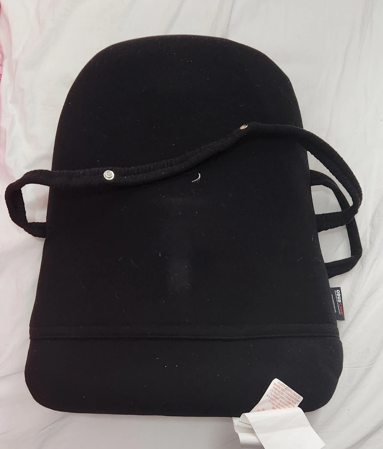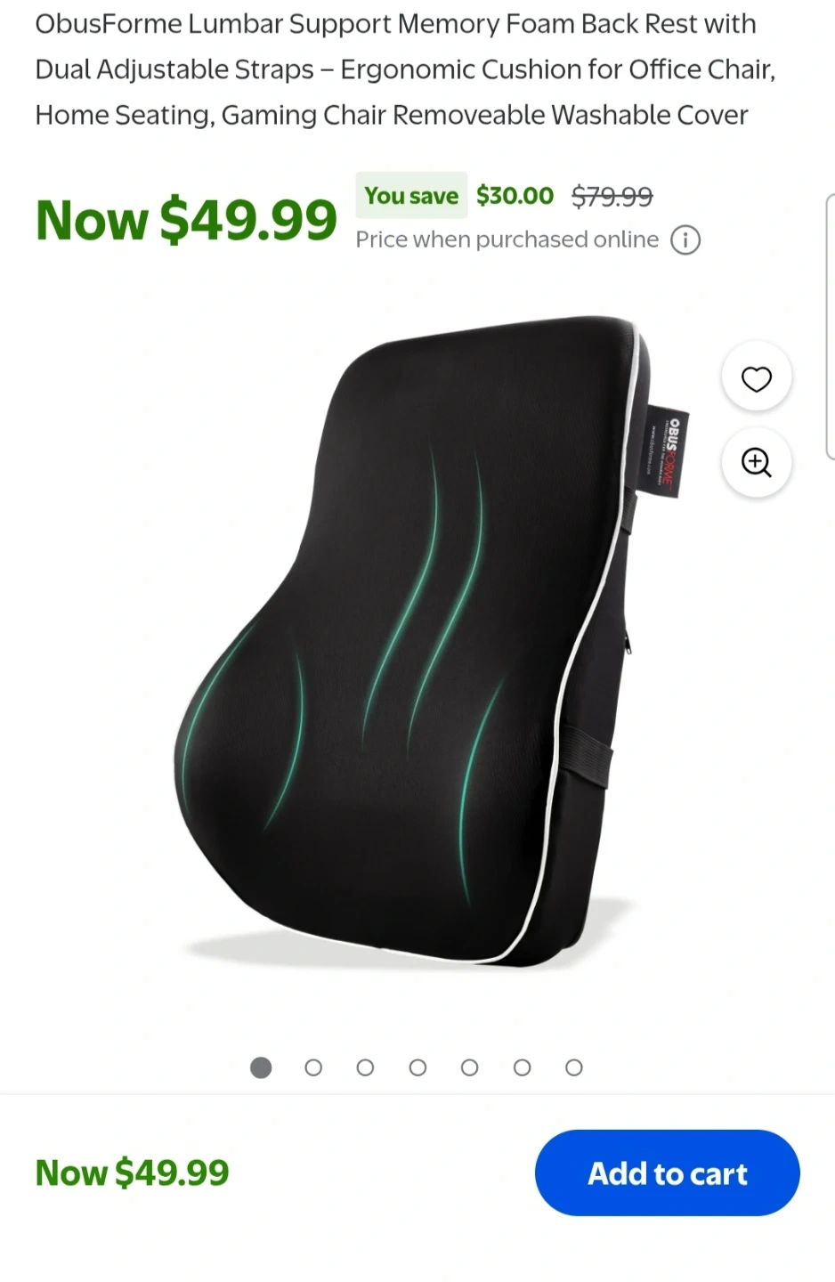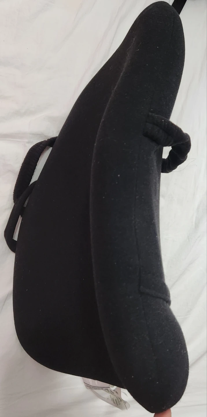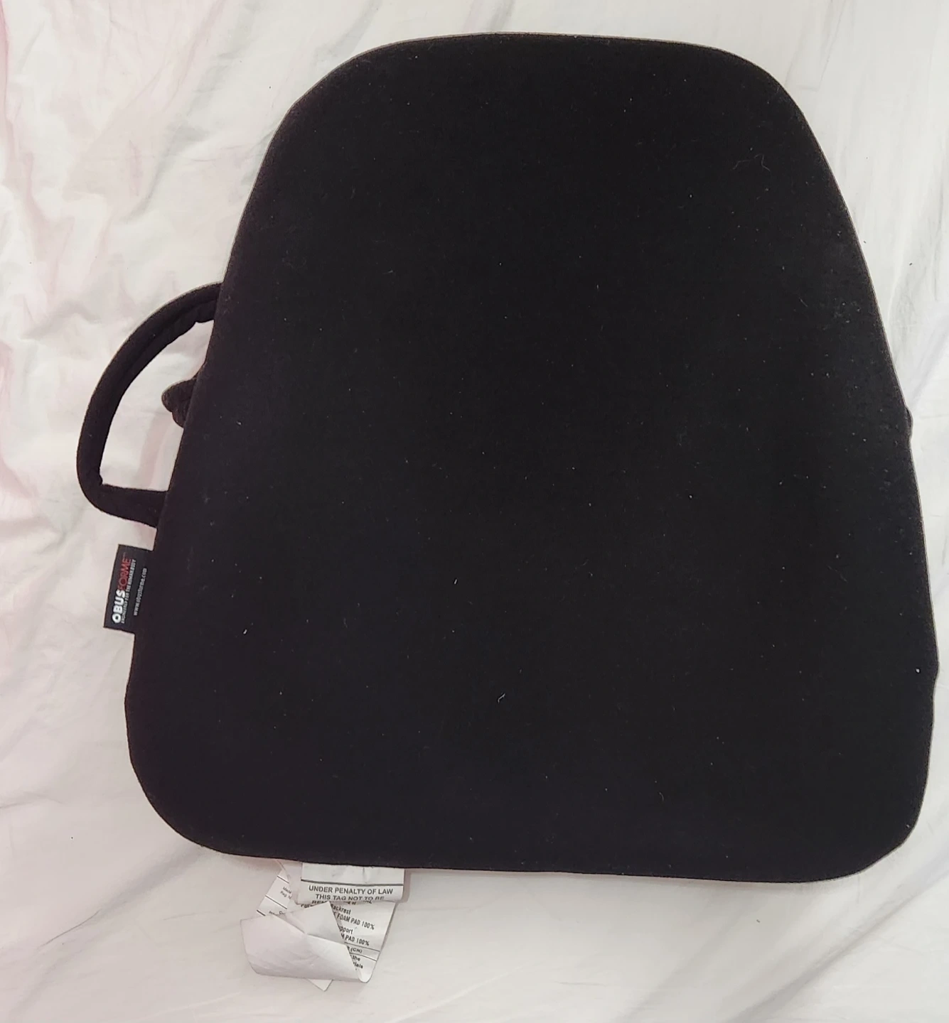 ObusForme lumbar support back rest in black. Features dual adjustable straps and ergonomic cushion. Washable cover included.