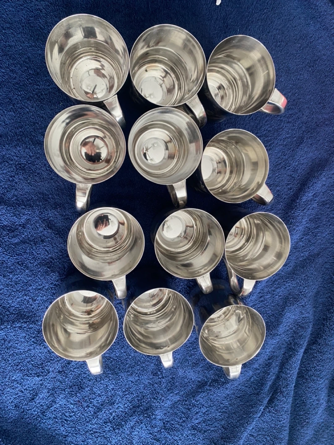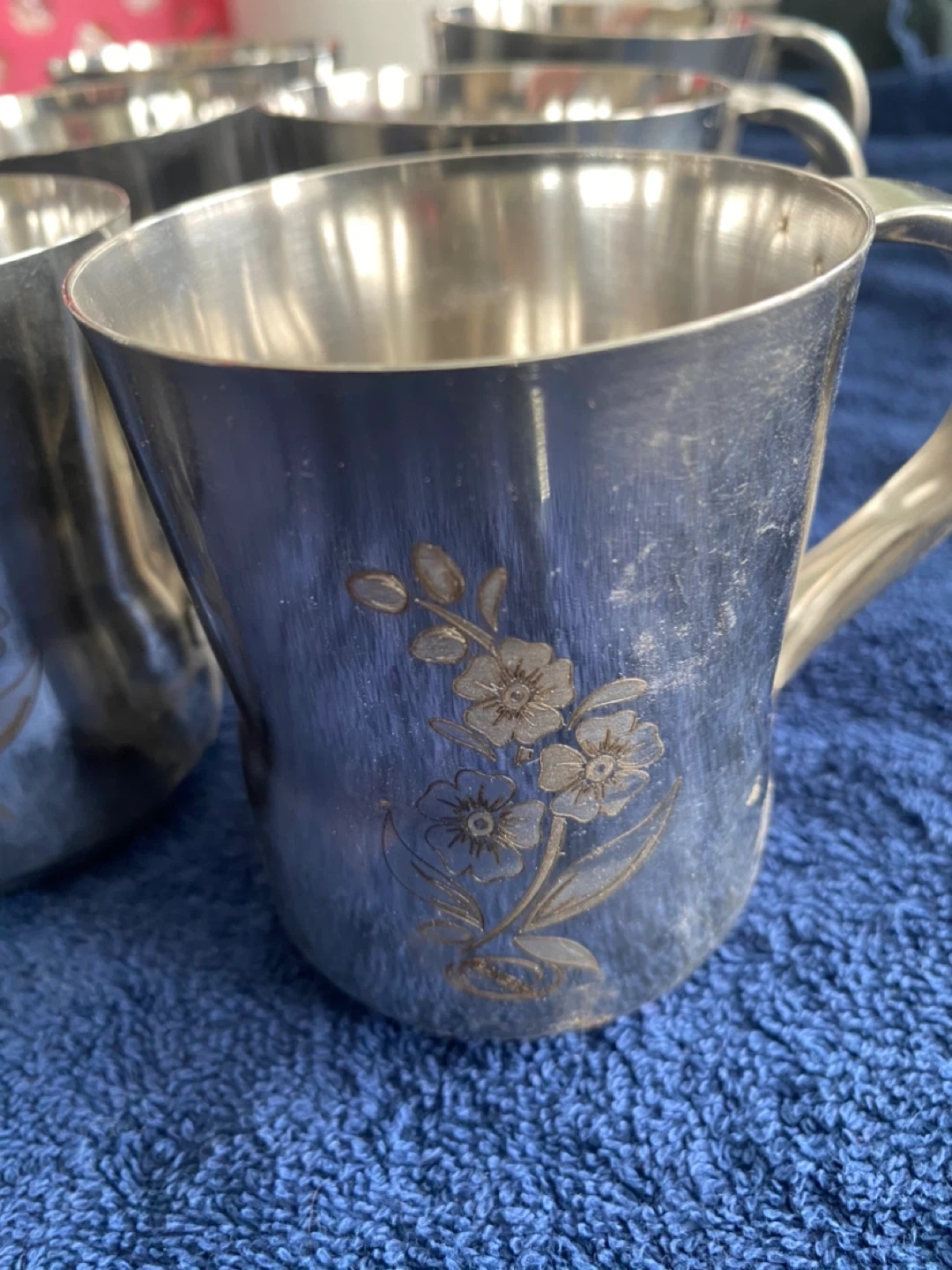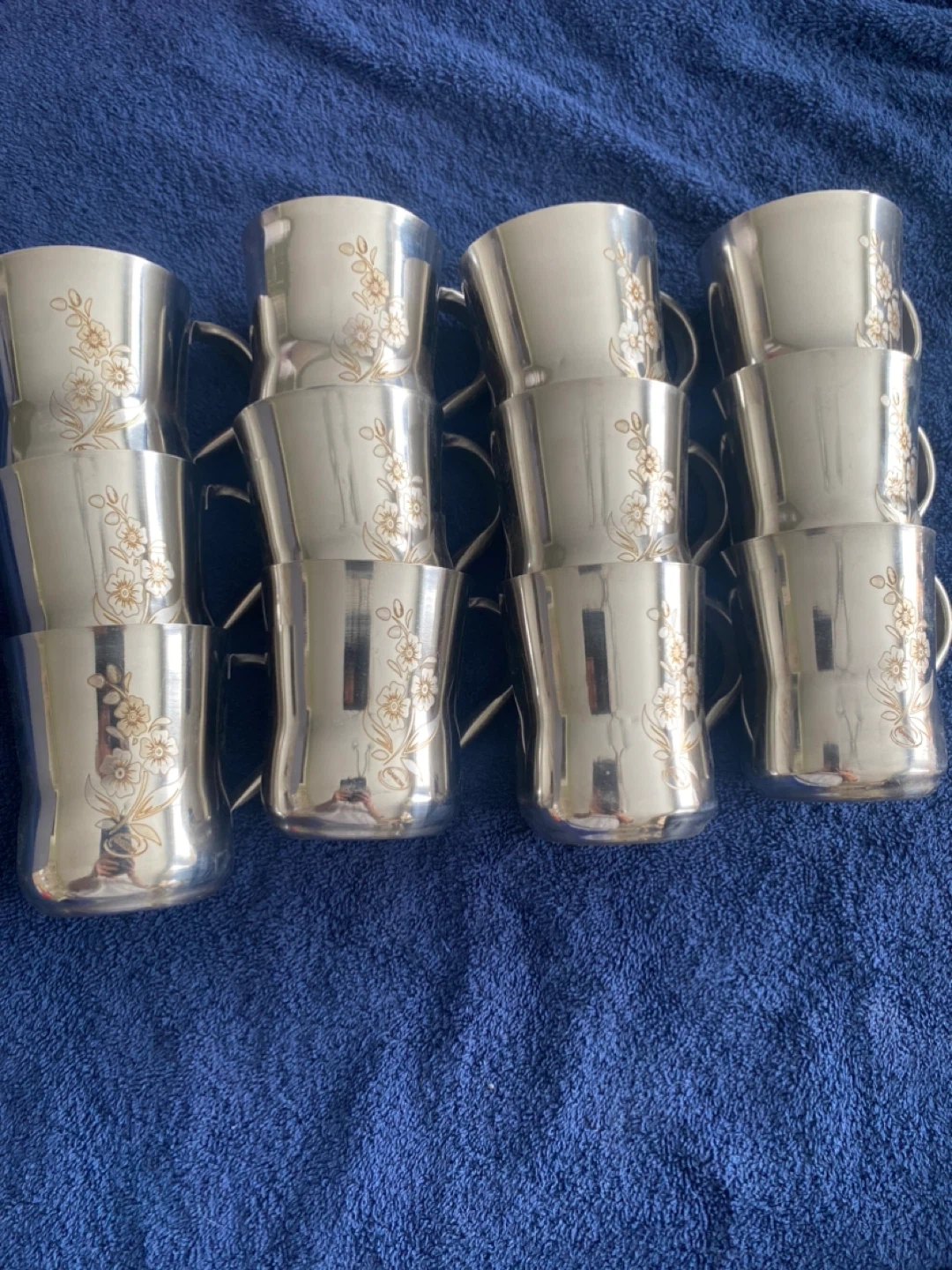 This is a set of 12 stainless steel cups. They feature a delicate floral design etched onto the exterior. Metal cups like these are handy for outdoor gatherings or for kids.