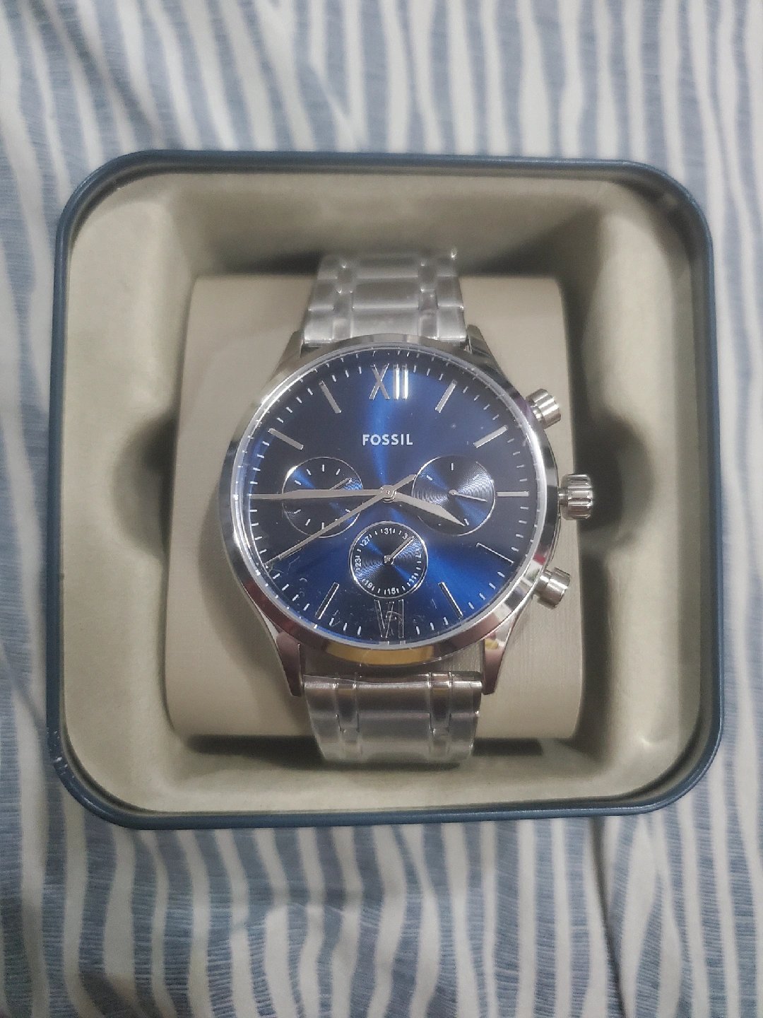 silver stainless steel with beautiful blue face