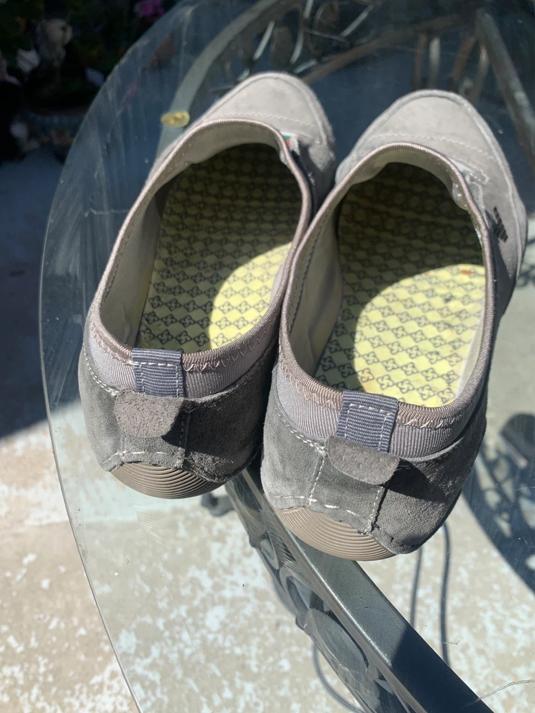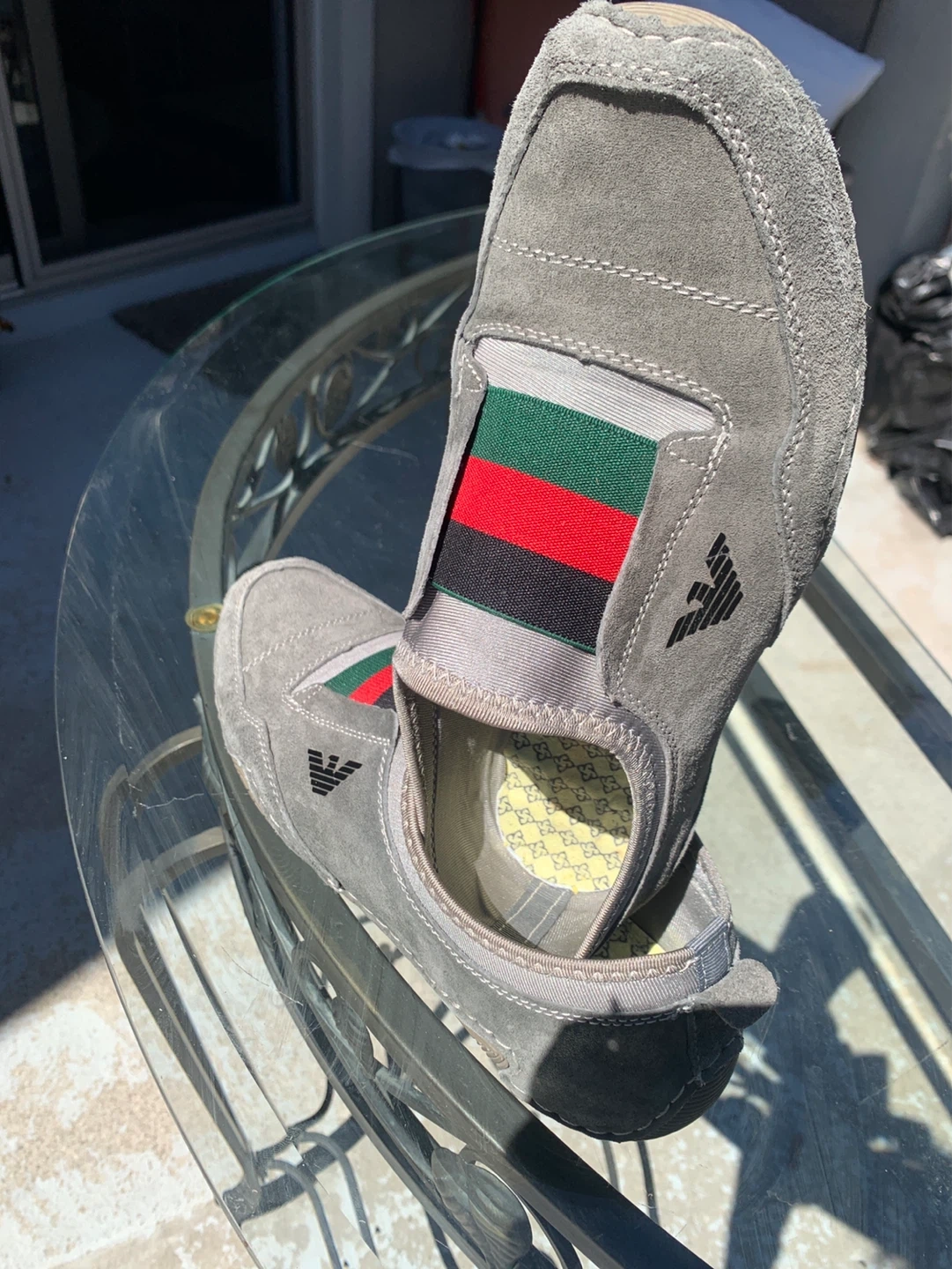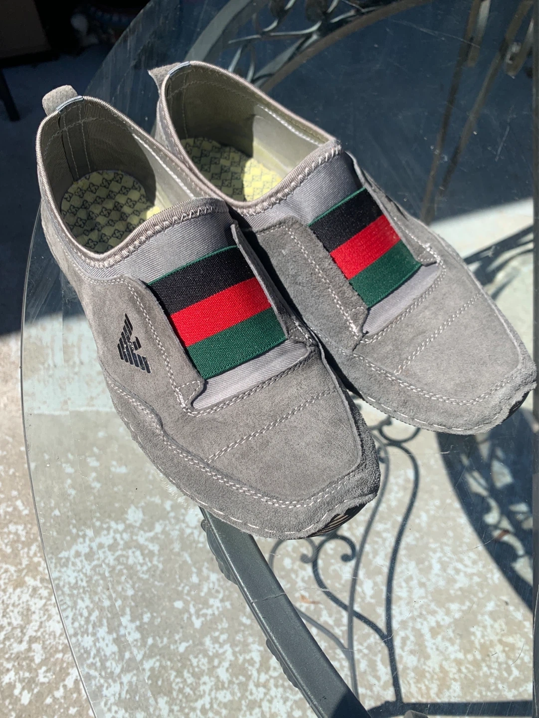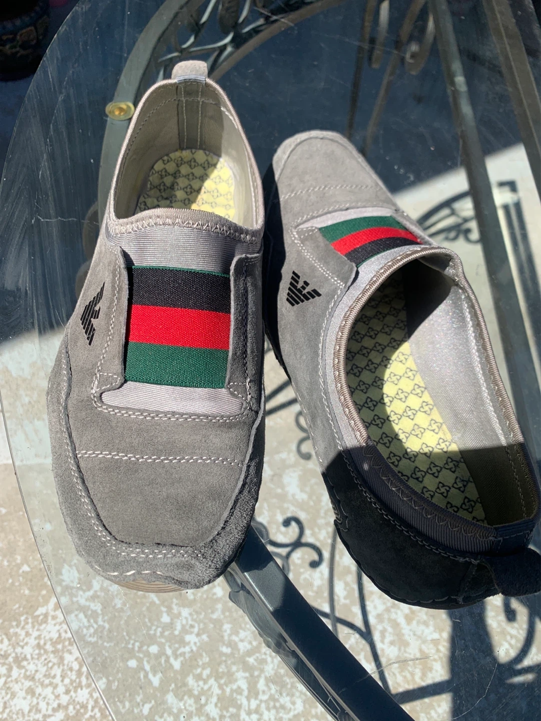 Emporio Armani slip-on shoes in grey suede. Features the iconic eagle logo and a stripe detail on the vamp. The interior lining has a repeating GG pattern. These shoes are great for casual wear.