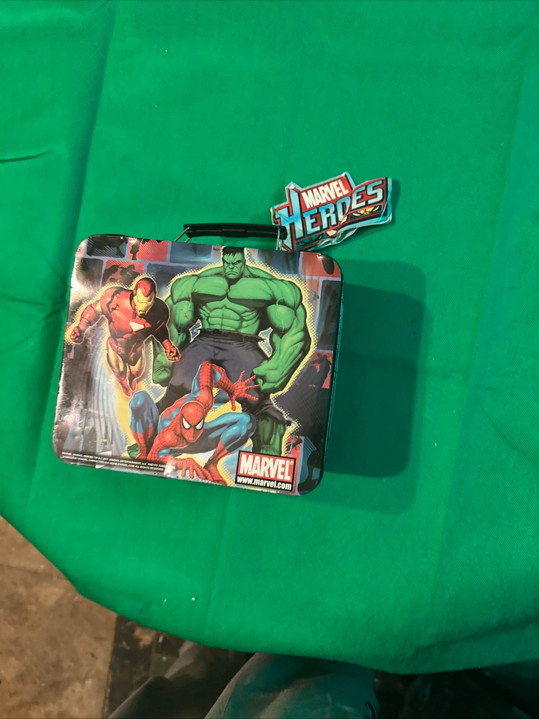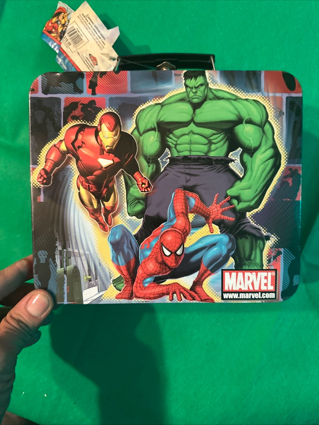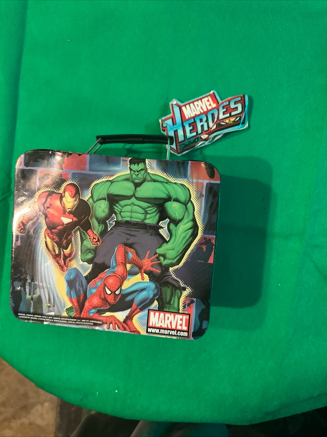 This is a vintage Marvel Heroes 2010 metal lunchbox featuring Ironman, Hulk, and Spider-Man. It measures 7" x 8" x 4" and is a great collectible for fans. Perfect for lunch or display.