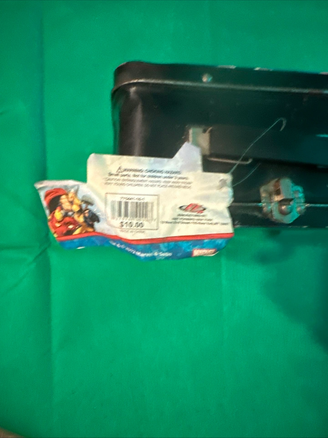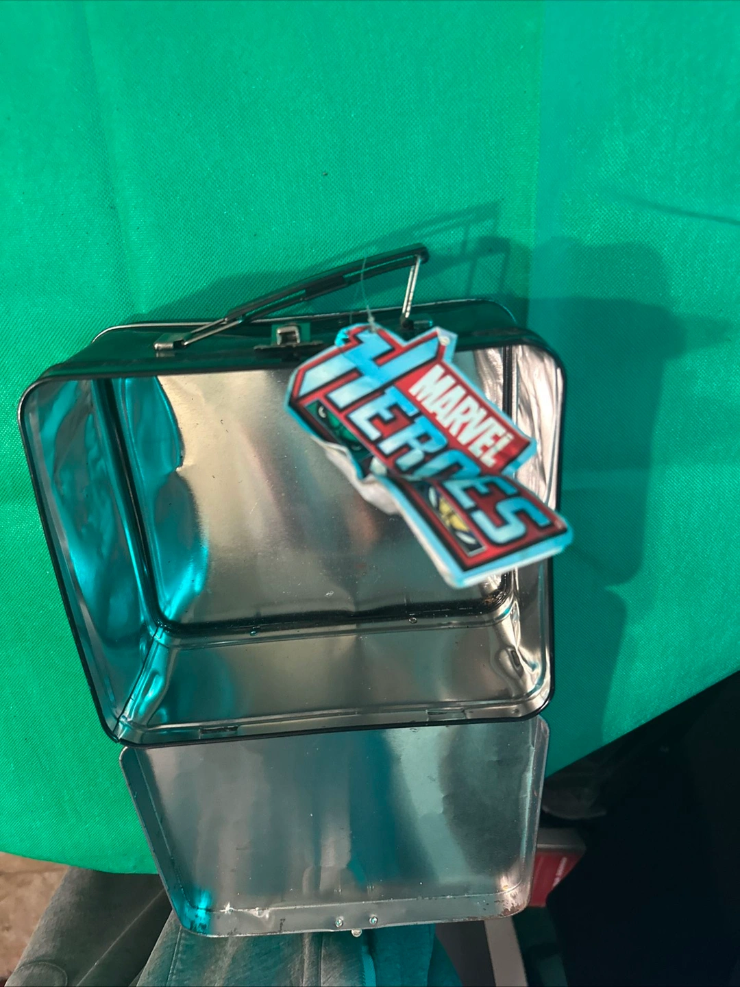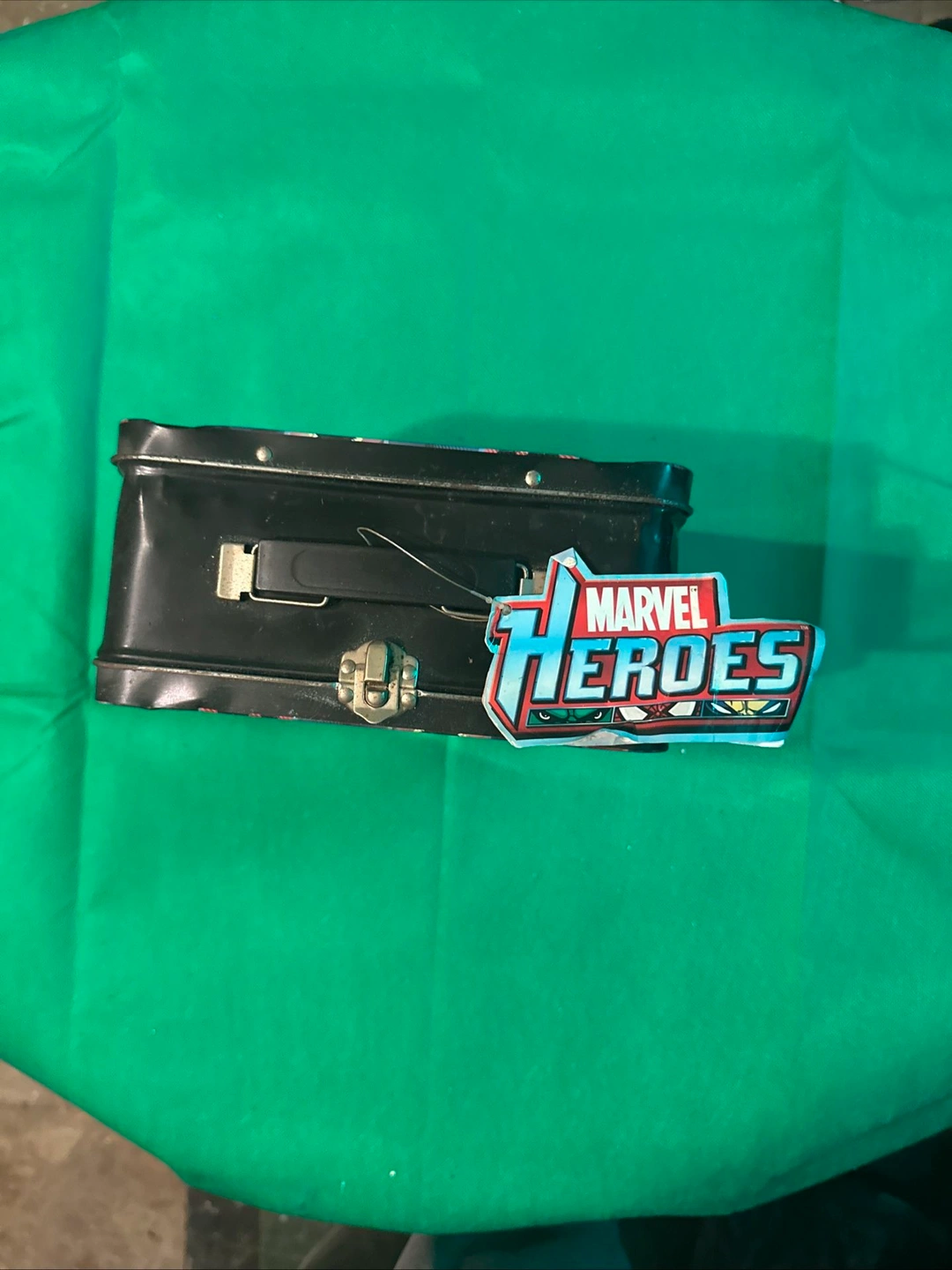 This is a vintage Marvel Heroes 2010 metal lunchbox featuring Ironman, Hulk, and Spider-Man. It measures 7" x 8" x 4" and is a great collectible for fans. Perfect for lunch or display.