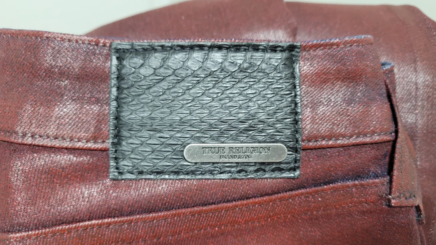 These are True Religion Brand Jeans in a burgundy colour. They're a skinny fit with a coated finish. Made in the USA. Cash only. Pick up only. Get it before it's donated. Final sale.