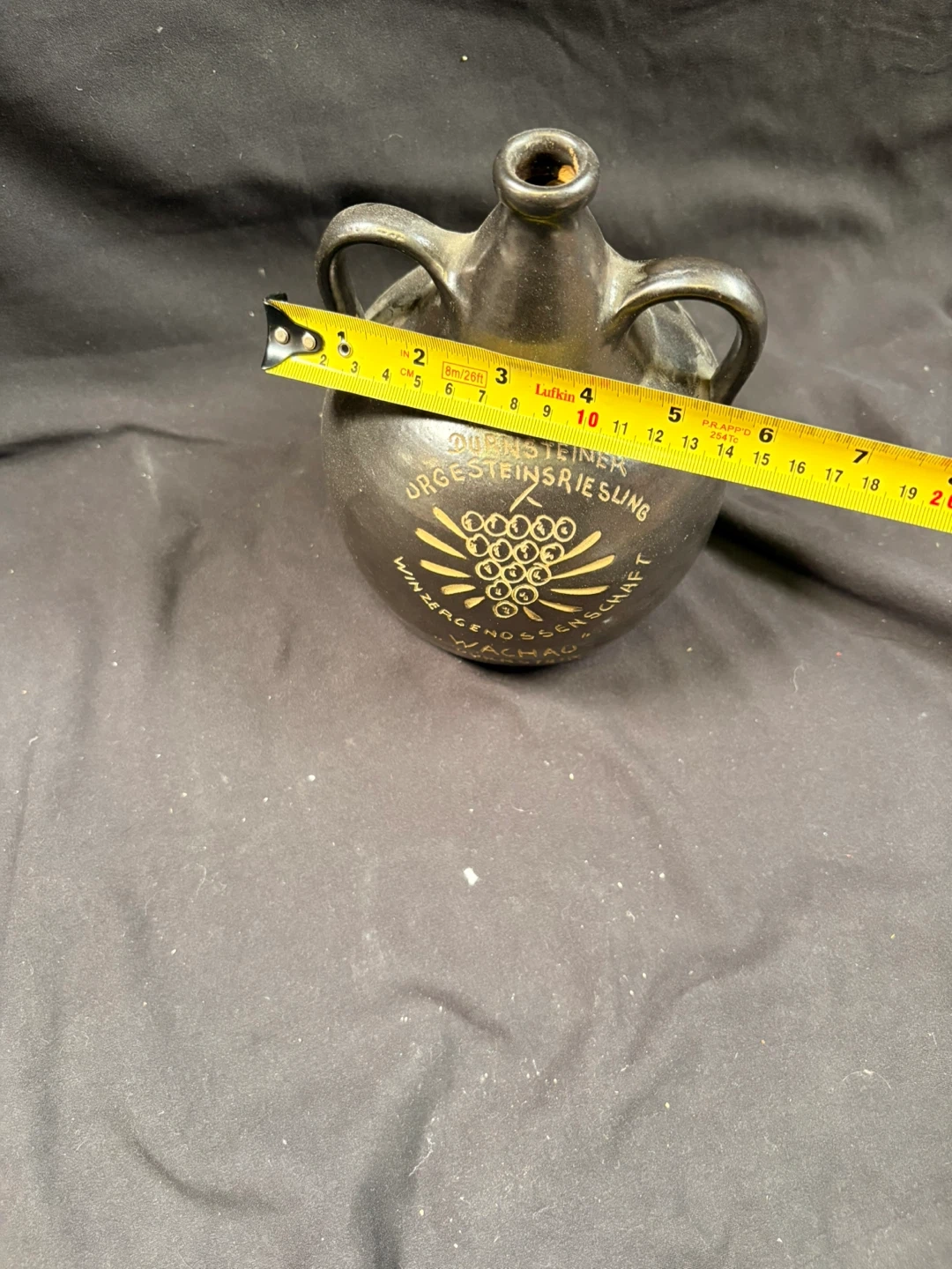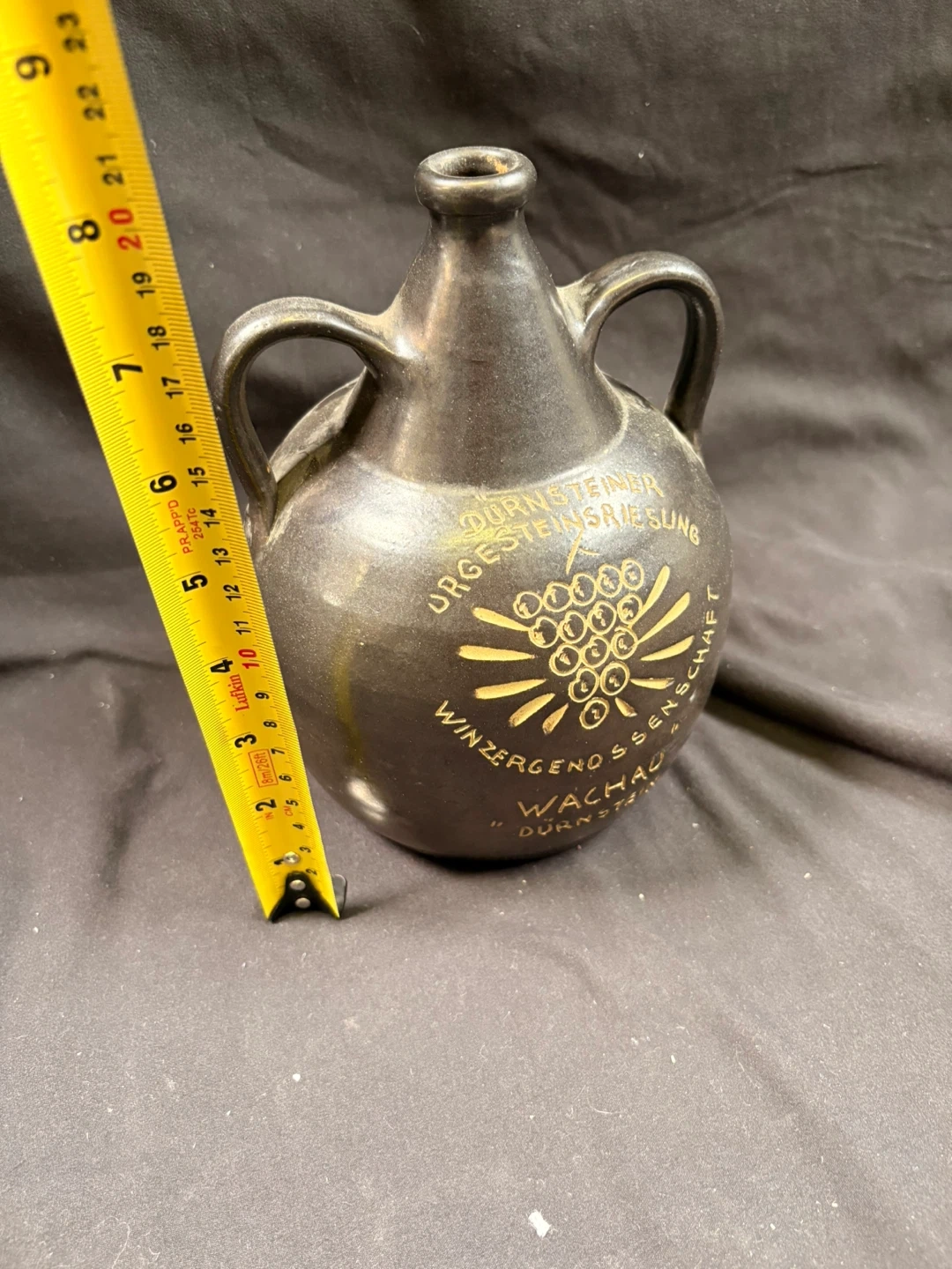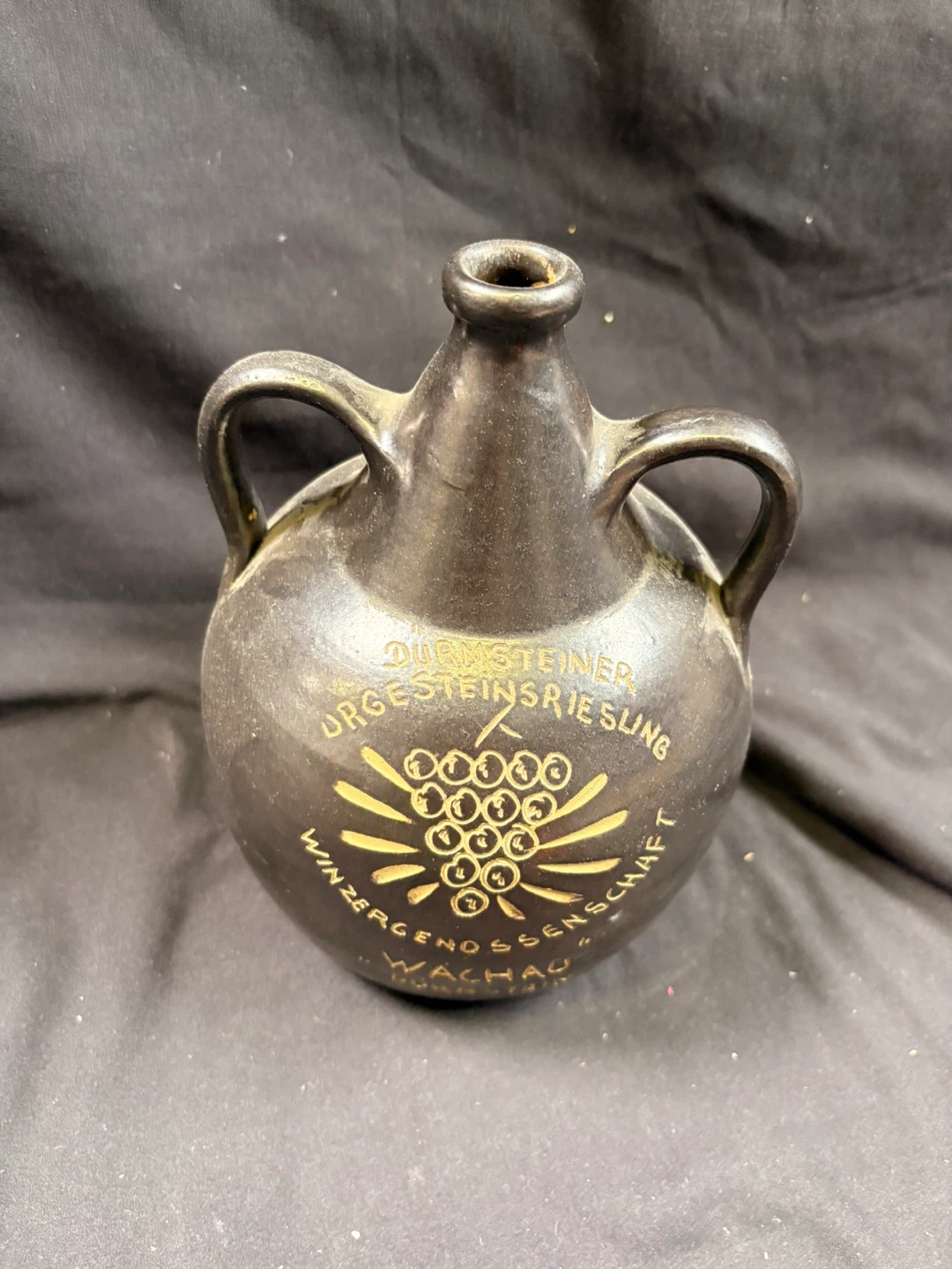 This is a Durnsteiner Urgesteinsriesling jug from Wachau. It's a dark brown ceramic jug with two handles and a narrow neck. The jug has gold lettering and a design of grapes.
