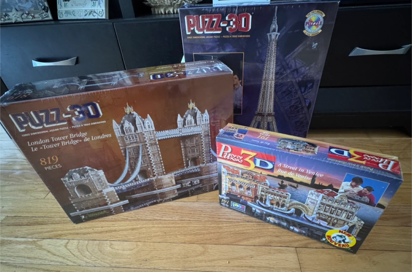 Selling 3 brand new, never opened Puzz 3D puzzles. Included is an 819 piece London Tower, a 703 piece Eiffel Tower, and a 191 piece A Street in Venice, Can be sold as a trio for $130 or individually for $45 for each of the larger puzzles and $25 for the smaller one. Comes from a smoke and pet free home. Pickup in Thornhill in the Bathurst and Rutherford area.