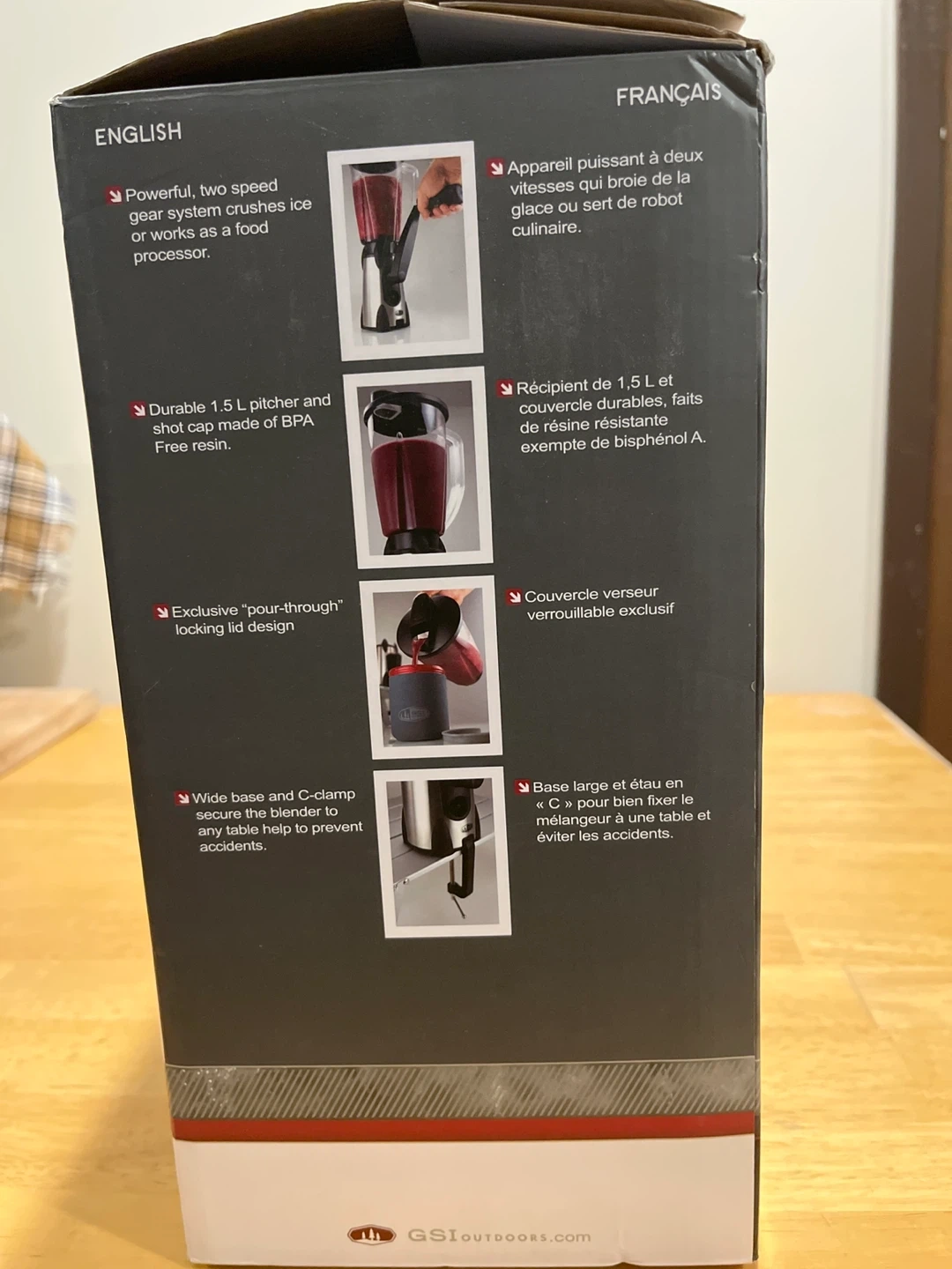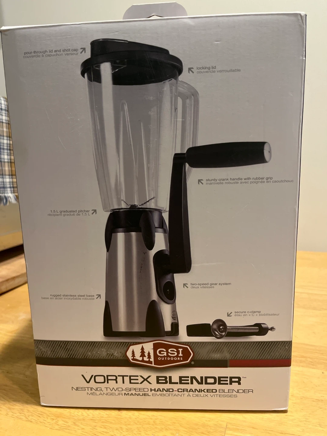 Nesting, two-speed, hand-cranked blender with a 1.5 L graduated pitcher. It's made with BPA-free copolyester resin and has a durable stainless steel base. Just attach it to a table or tailgate using the handy C-clamp.