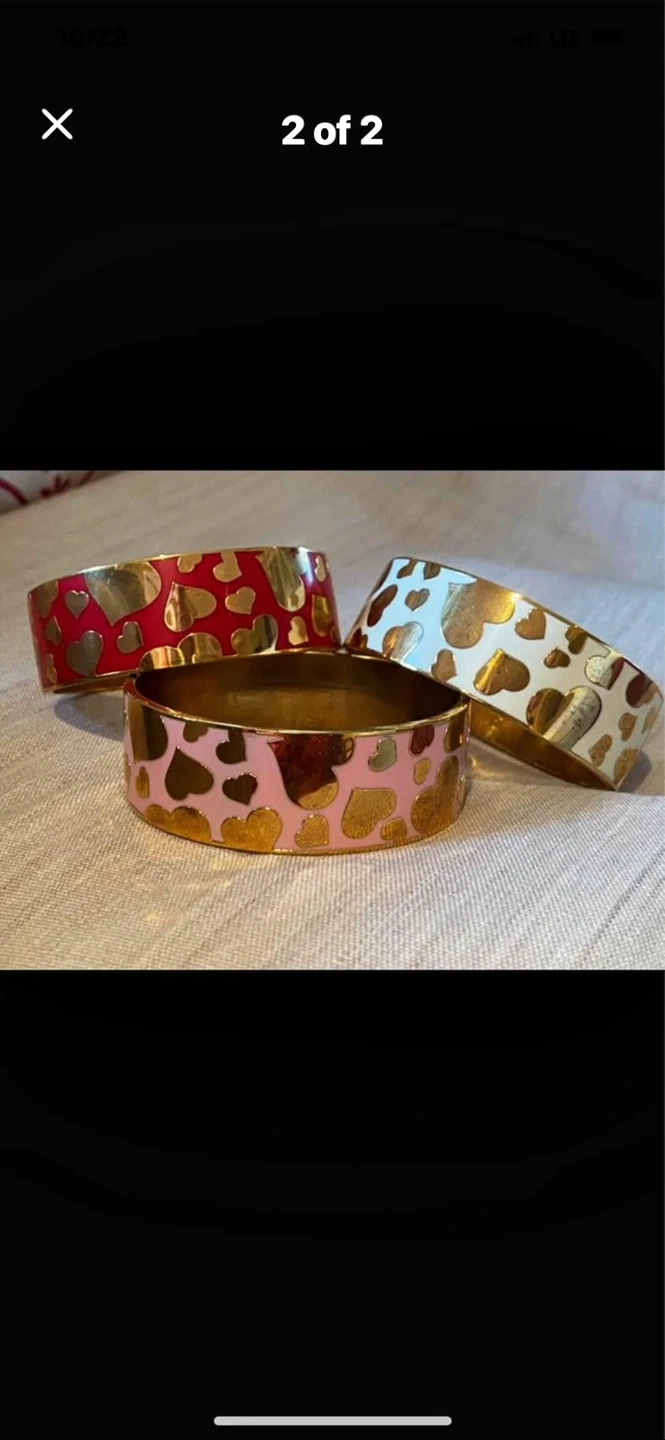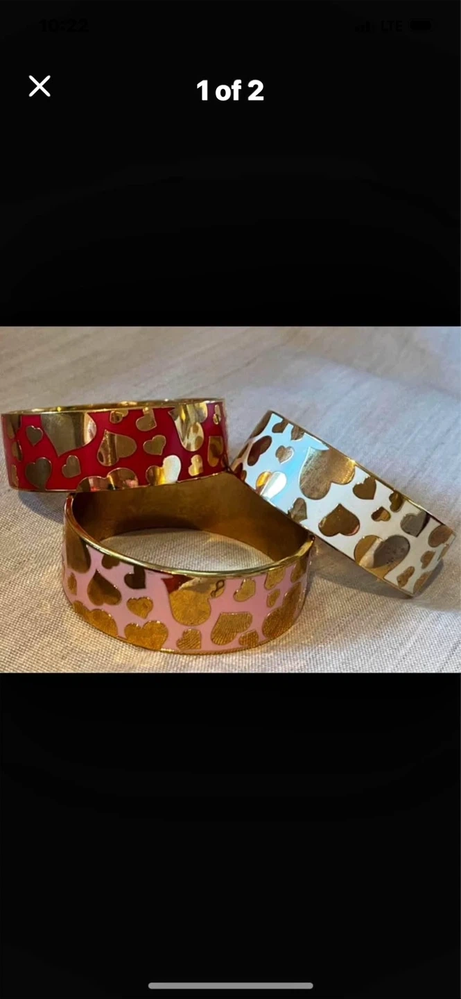 💖Three fabulous metallic bangle bracelets with fun gold heart pattern. 💖Includes red, pink, and white options. These bracelets add a romantic touch to any outfit!💖$40/each or all 3 for $100!💖