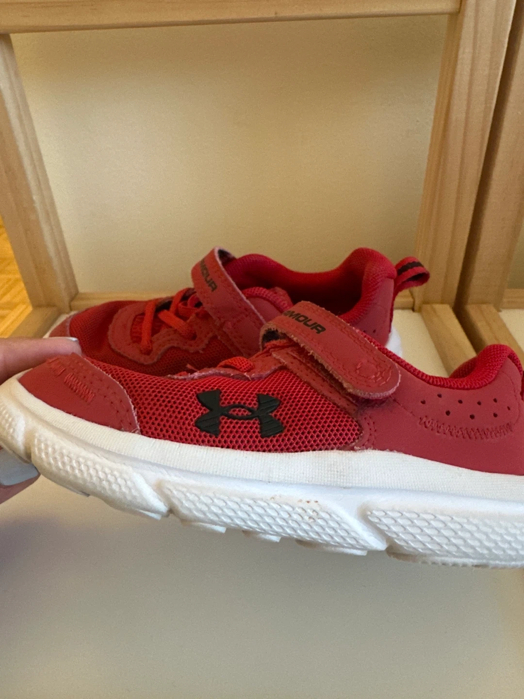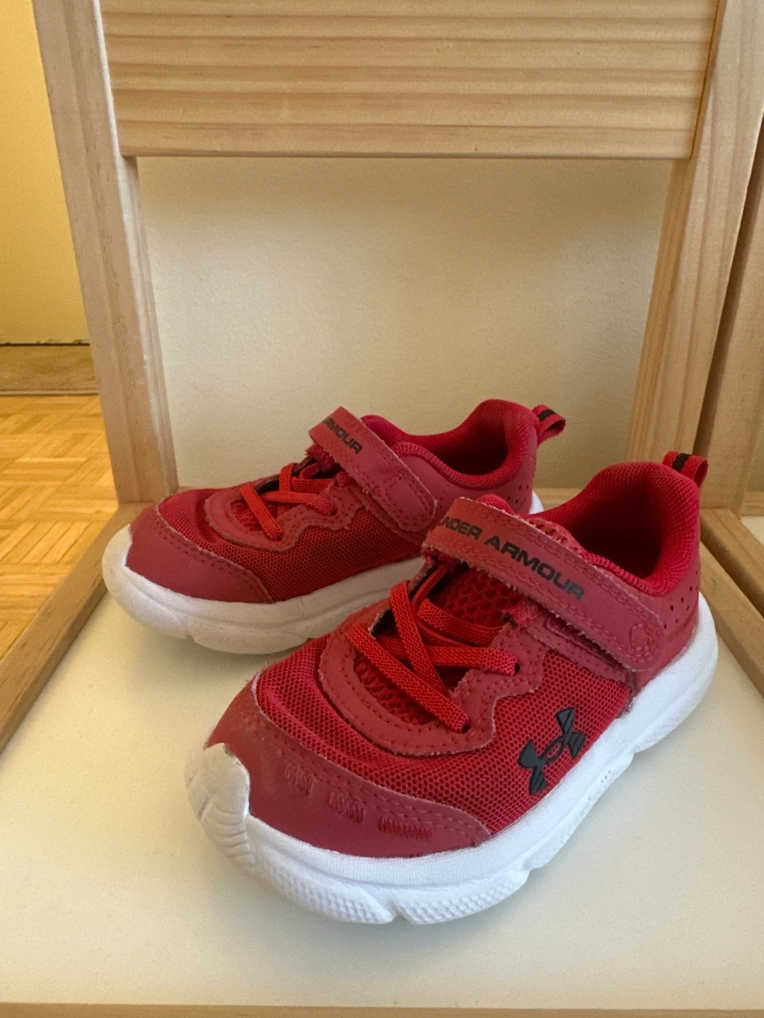 These are Under Armour toddler sneakers in red. They have velcro straps for easy on and off. Perfect for active little ones getting ready to run and play!