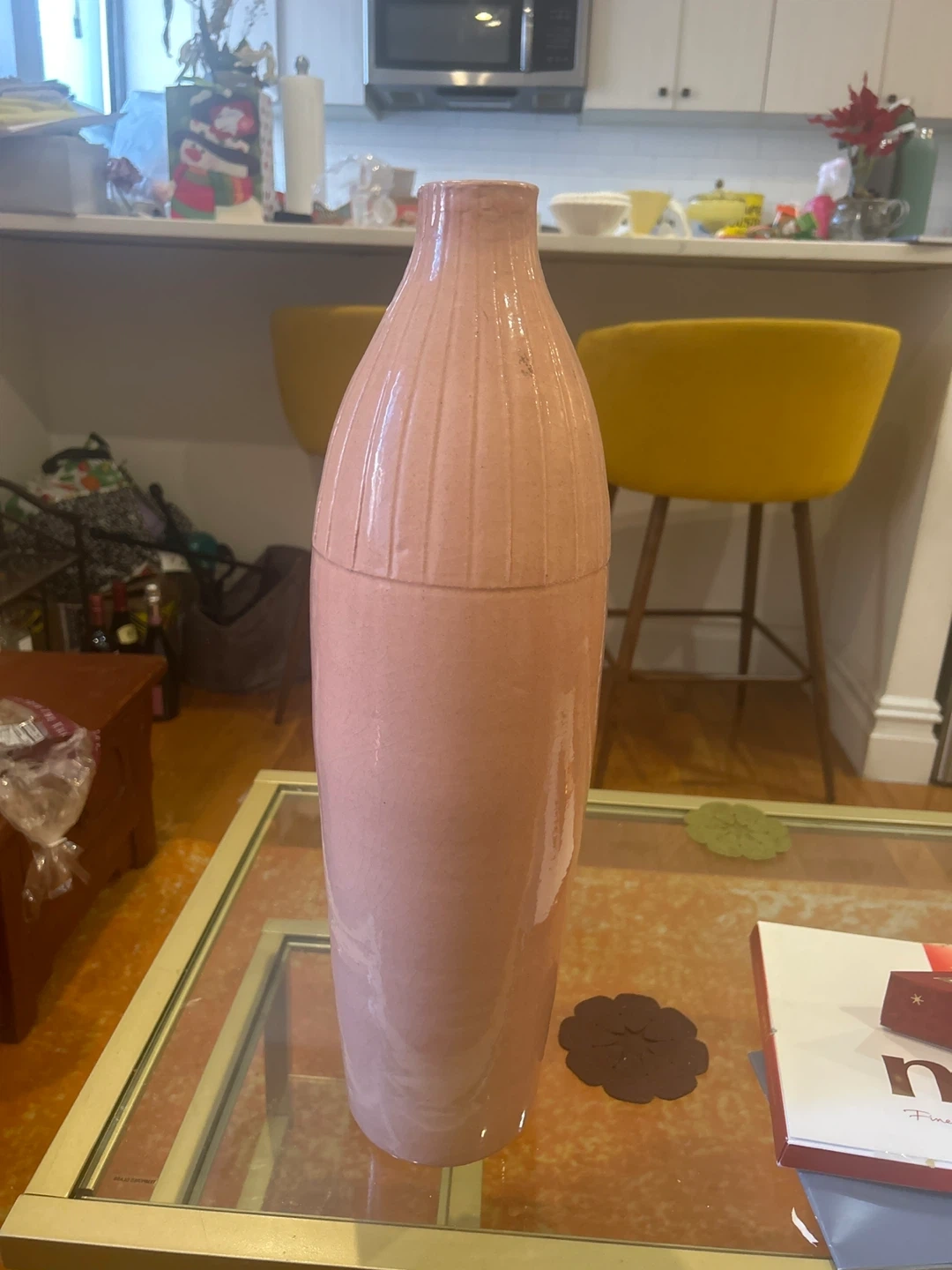 Selling a lovely pink decorative vase! It's in great condition and would look perfect in any room. The vase has a unique ridged design on the top half, adding a touch of texture and style to your decor