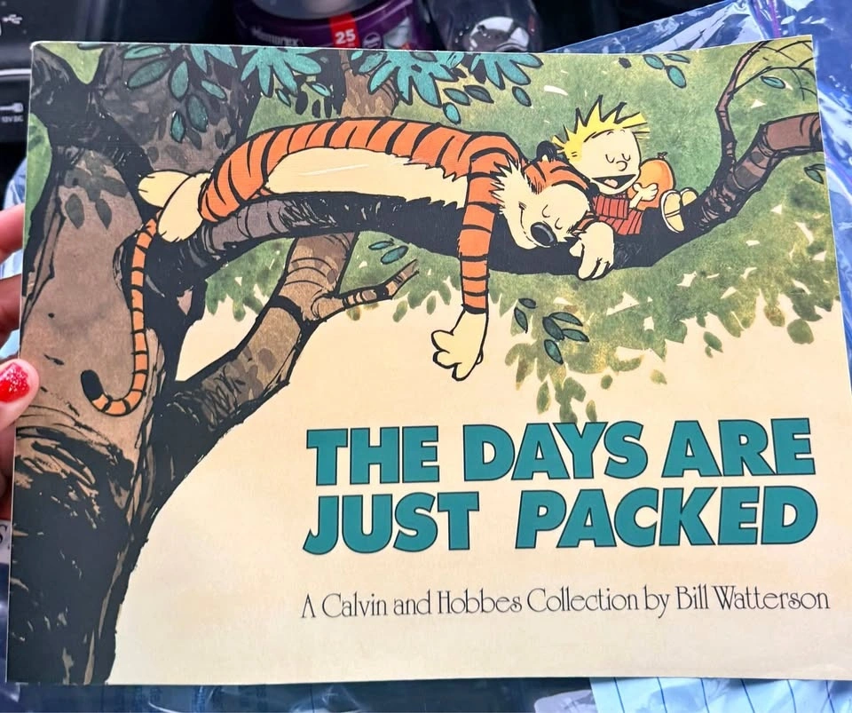 This is "The Days Are Just Packed: A Calvin and Hobbes Collection" by Bill Watterson, a popular comic strip collection book featuring the characters Calvin and his stuffed tiger Hobbes.
