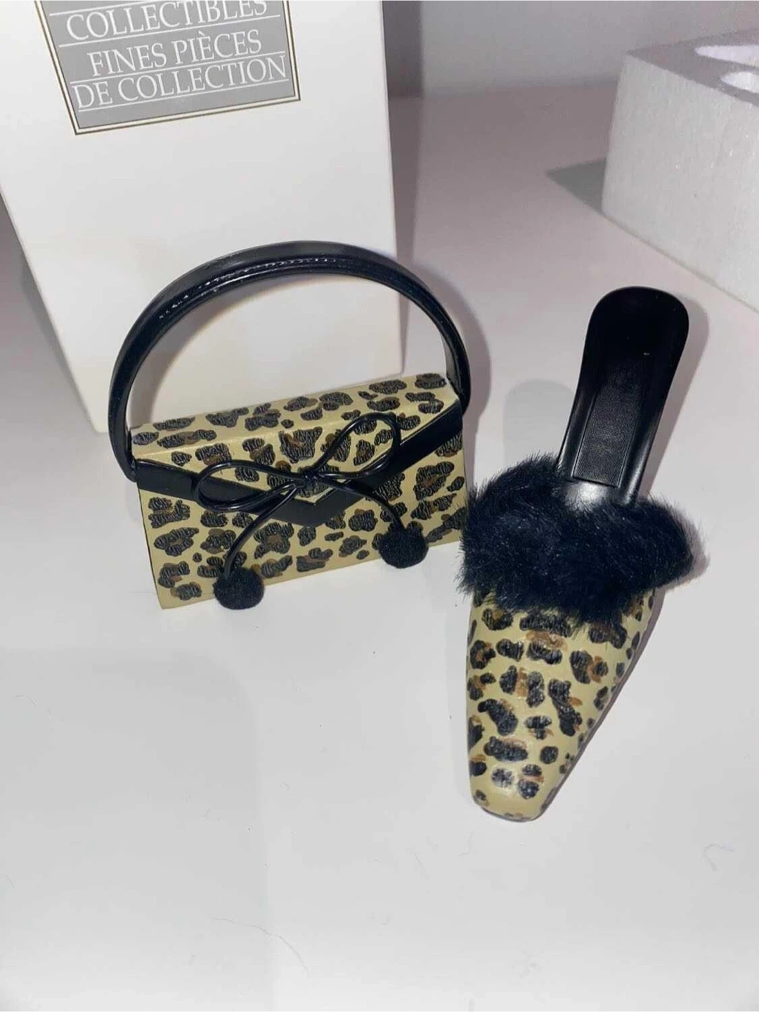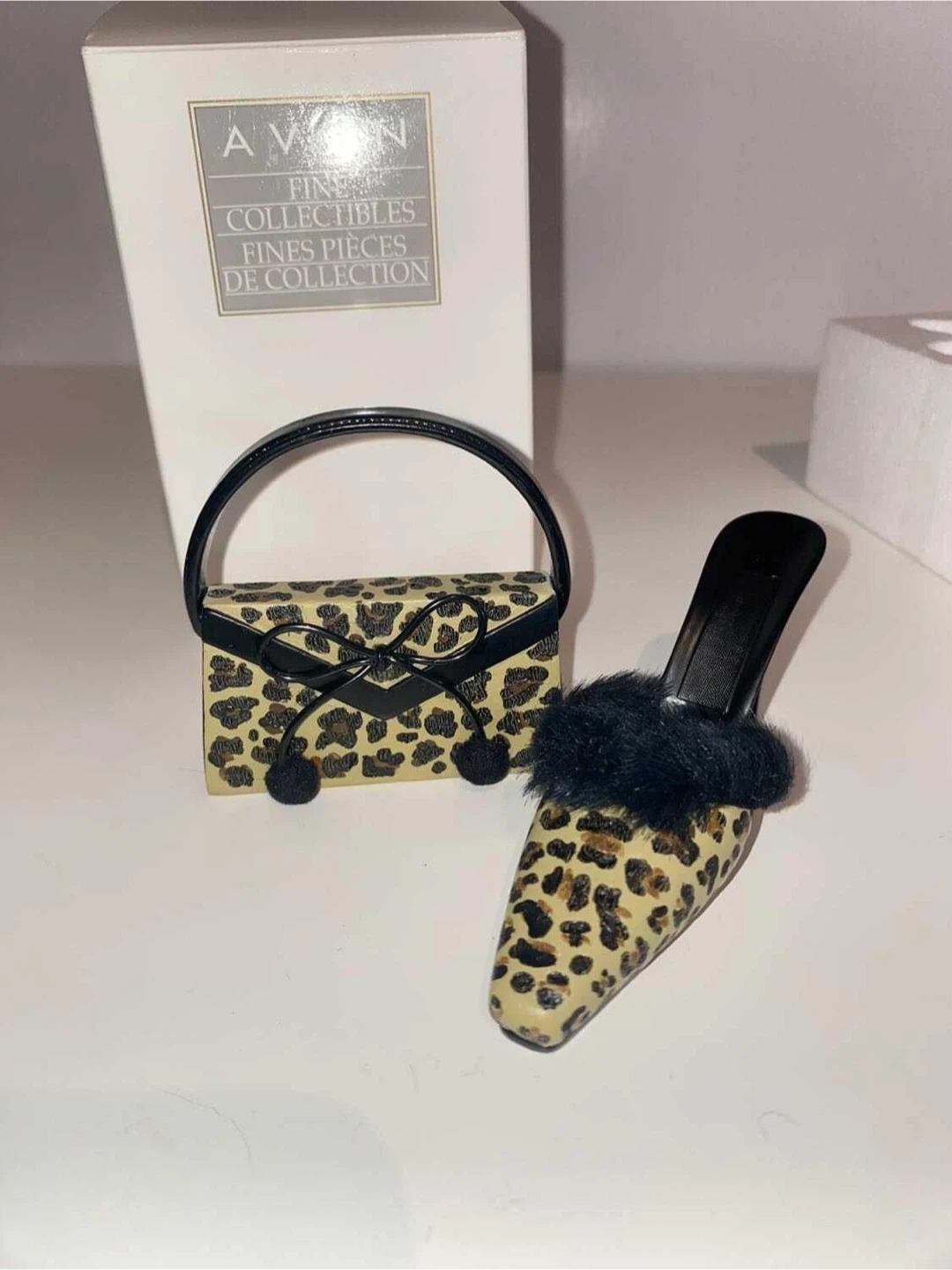 This is an Avon collectible set featuring a miniature high heel shoe and a matching handbag. Both pieces are adorned with a leopard print design and a black bow accent. The shoe also has a fluffy black trim.