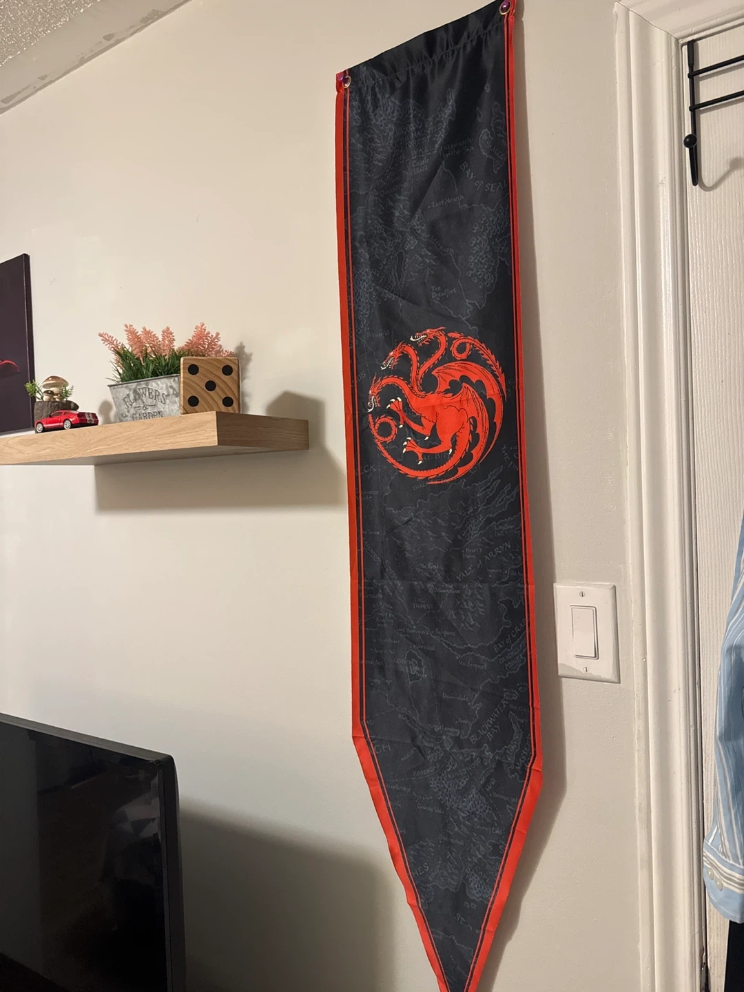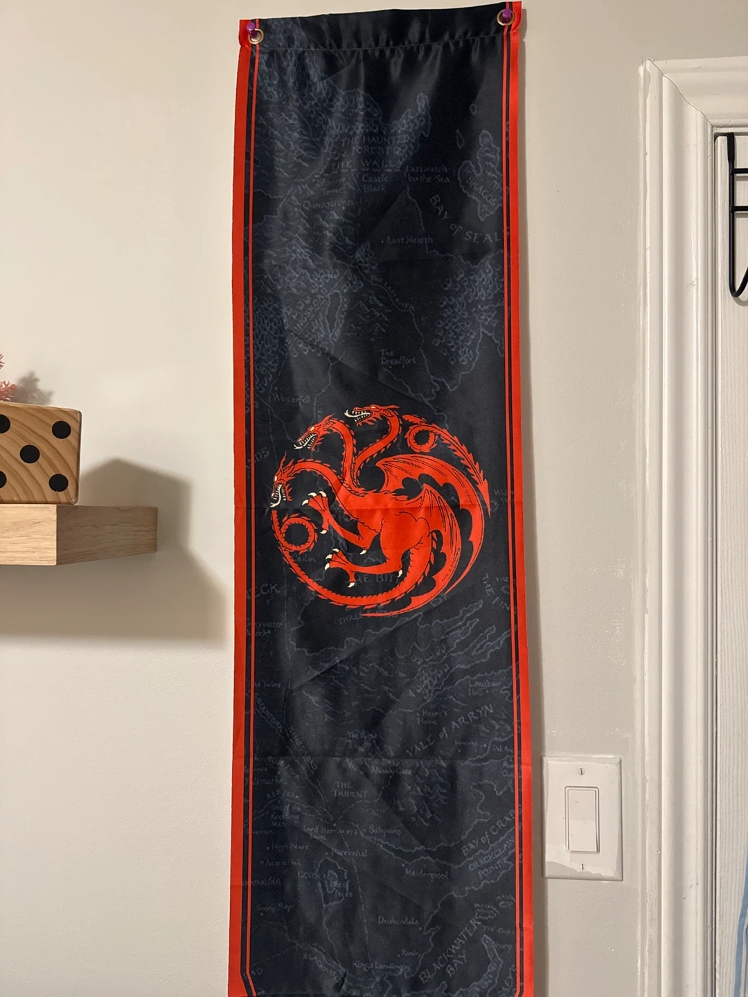 This is a Game of Thrones banner featuring the Targaryen sigil and a map of Westeros. It's made of fabric and has grommets for hanging. Perfect for any fan!