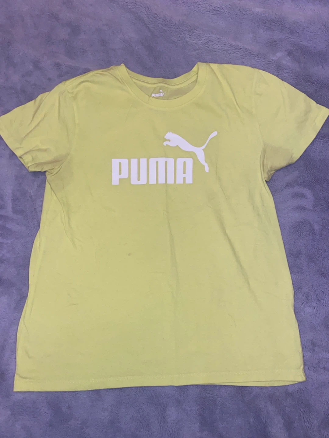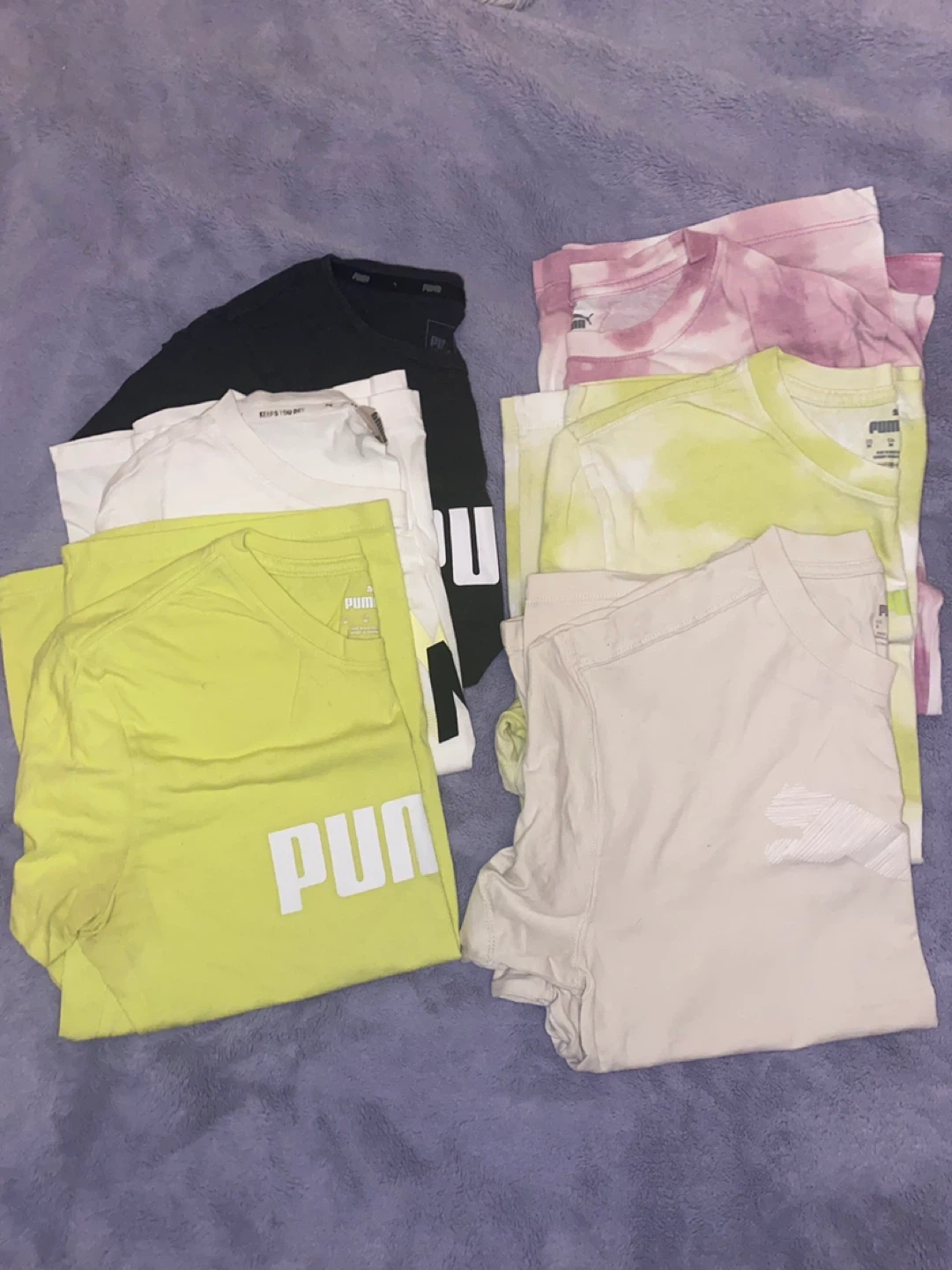 This bundle includes six women’s S/M Puma t-shirts in various colours and designs. You'll get a dark grey t-shirt with a large Puma logo, a white t-shirt with a yellow and black Puma logo, a lime green t-shirt with a white Puma logo, a white t-shirt with a subtle embossed Puma logo, and two tie-dye t-shirts (one pink/purple, one yellow/green). Perfect for casual wear or athletic activities!
