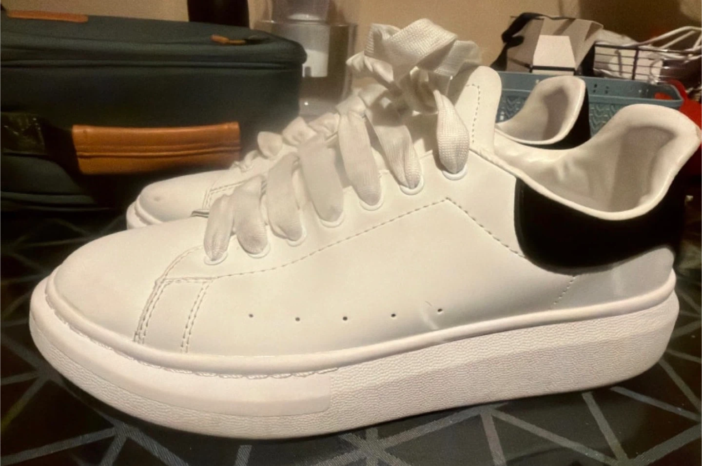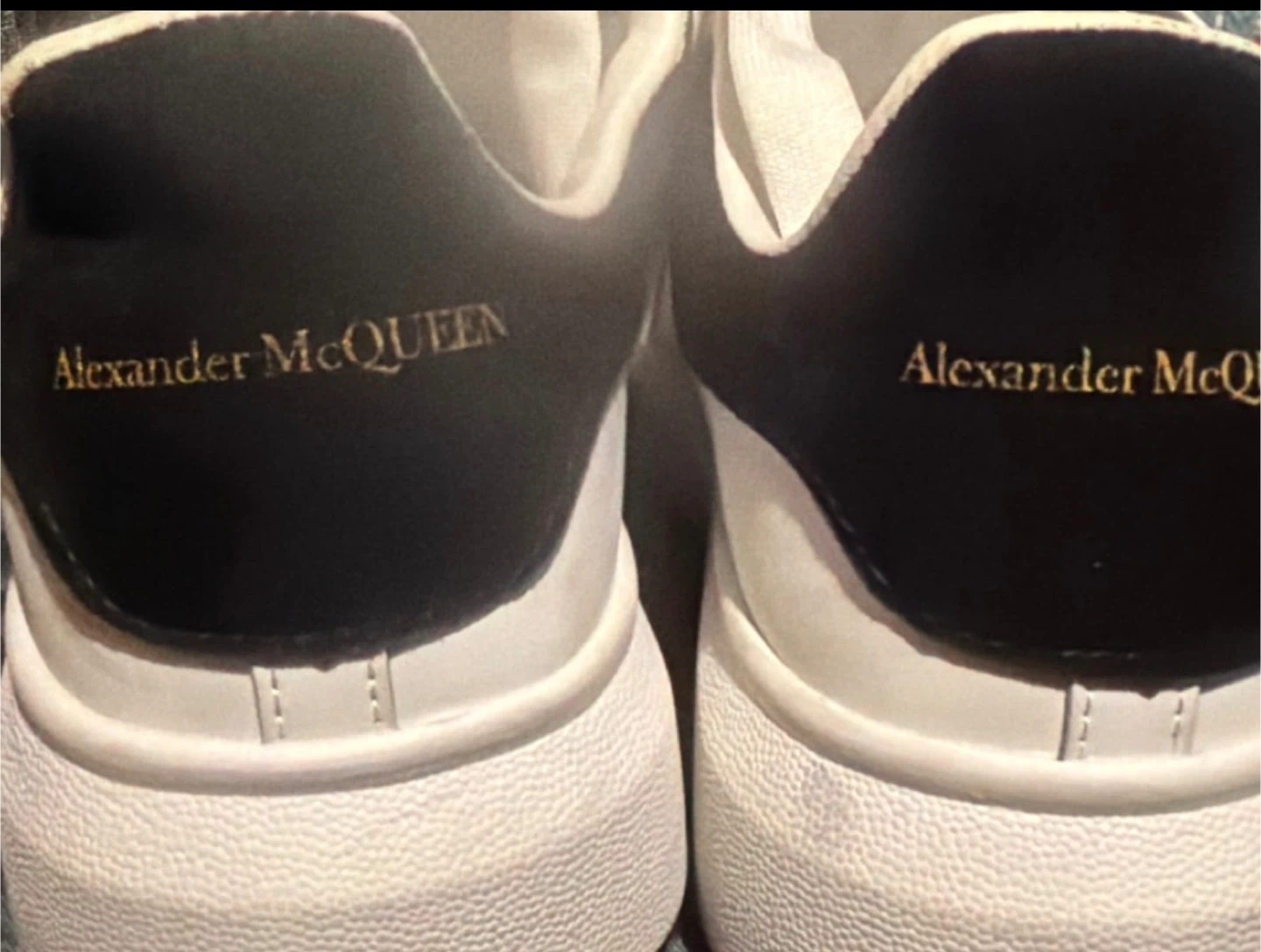 Alexander McQueen white leather sneakers with a black heel accent. These are a size 43. Platform sole design.