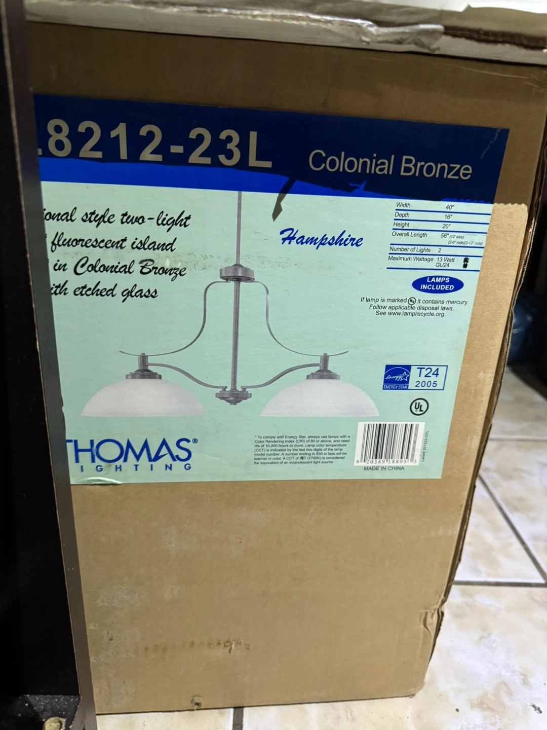 This is a Hampshire 2-23L Colonial Bronze chandelier. It's a transitional style two- light compact florescent. It is 40” wide, 16” deep and 20" high, with an overall length of 56".