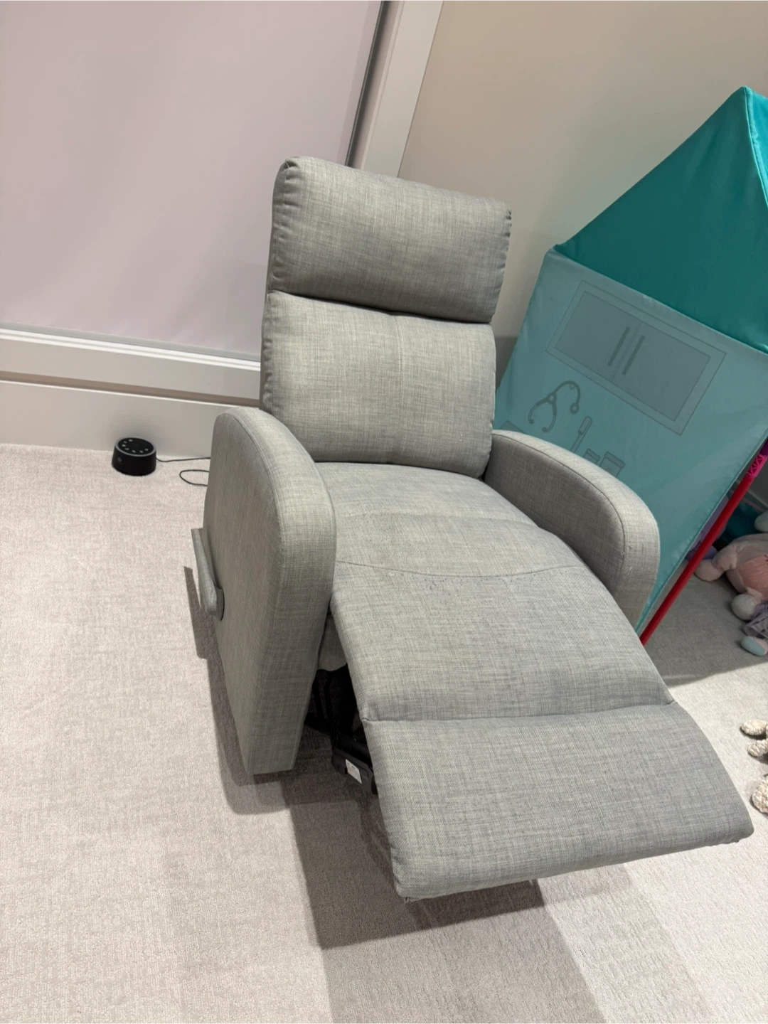 Selling a comfy grey recliner chair… perfect for a reading nook or nursery. The fabric is a nice neutral grey that would fit in with any decor. It's super comfortable and easy to recline. 5 years old, slight pilling at the seat.