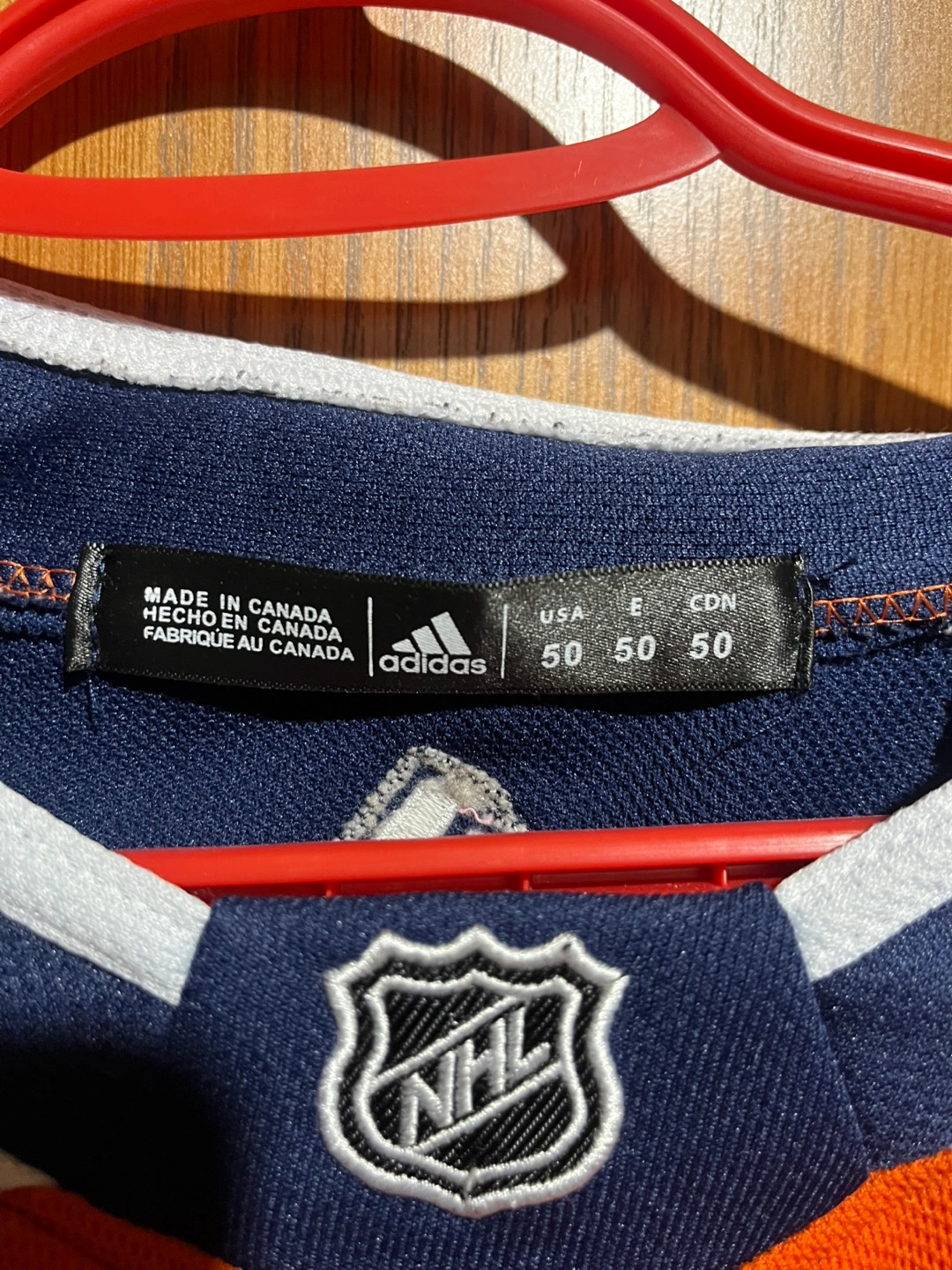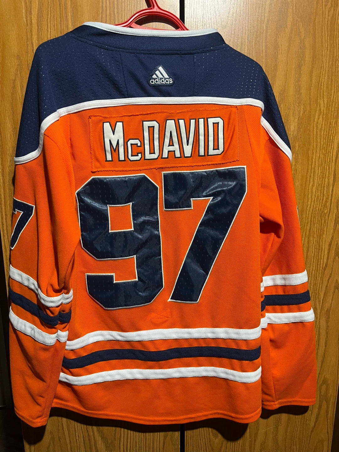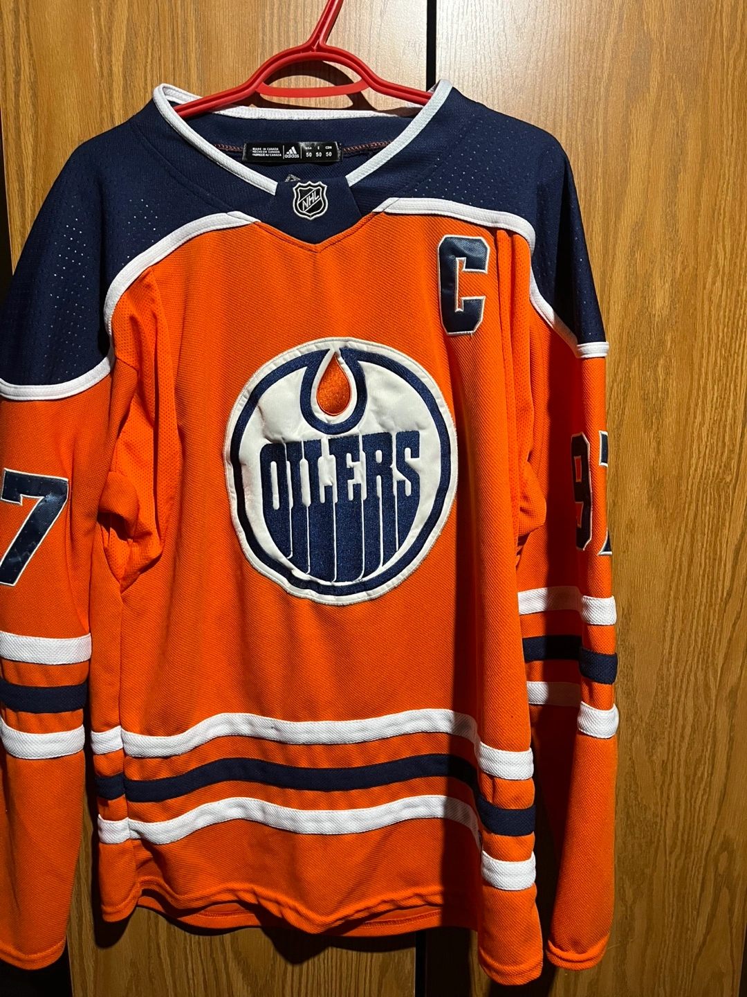 Adidas Oilers jersey, size 50, with McDavid's name and number on the back. Made in Canada.