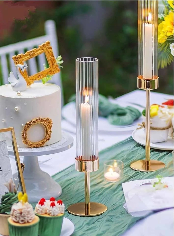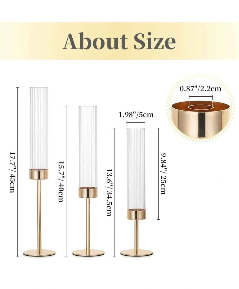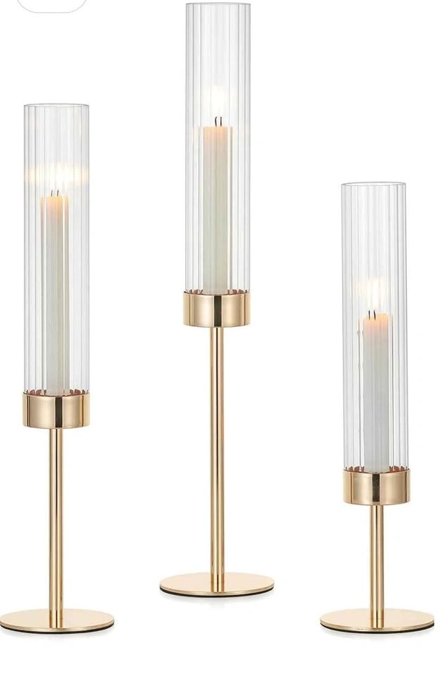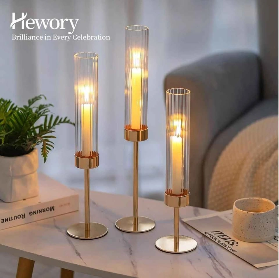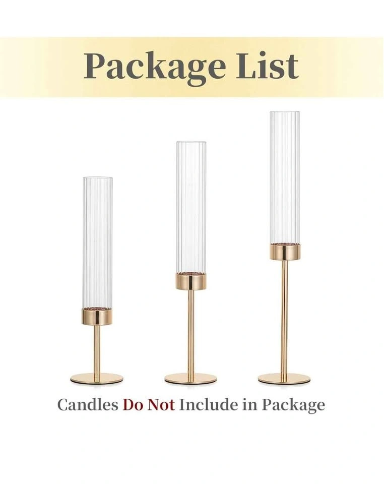 Hewory Gold Taper Candle Holders: Candlestick Holders Set of 3 Hurricane Glass Tall Candle Holder for Candlesticks Candle Sticks Holder Decor for Table Centerpiece Wedding Party Christmas Decorations.