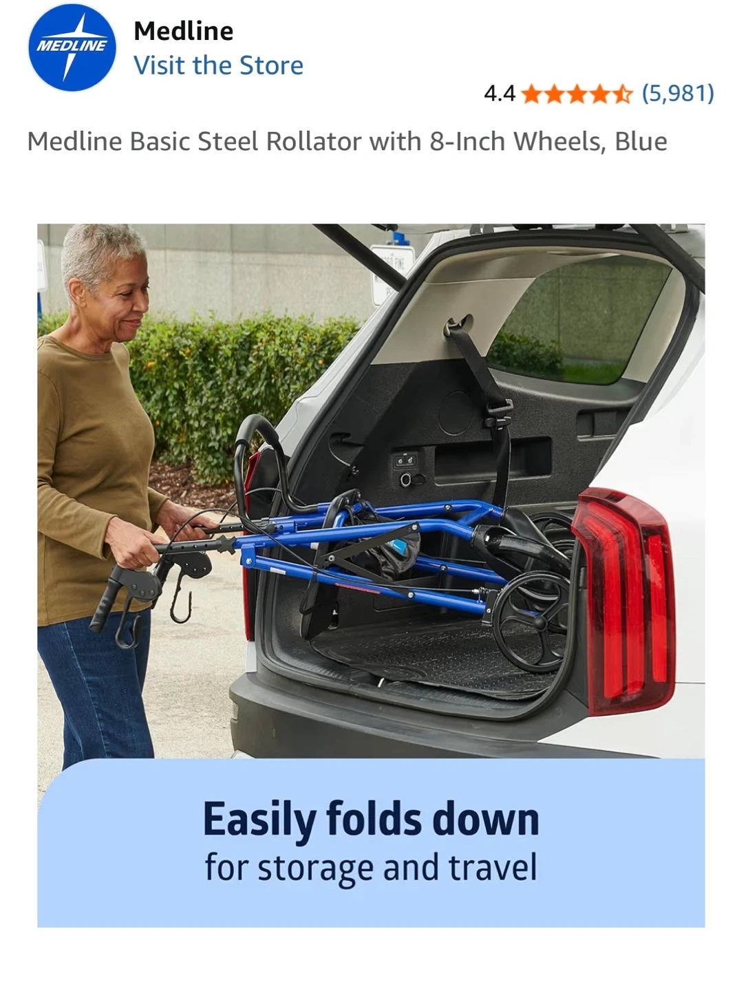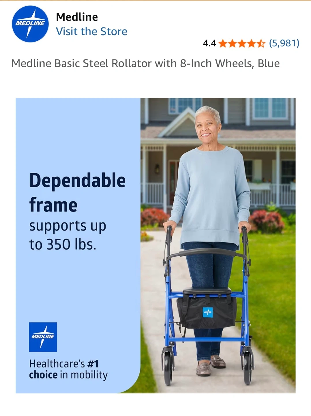 This Medline rollator walker features a teal steel frame and a comfortable seat with a removable storage bag. It's designed for dependable mobility support. The 8-inch wheels offer smooth rolling indoors and outdoors.