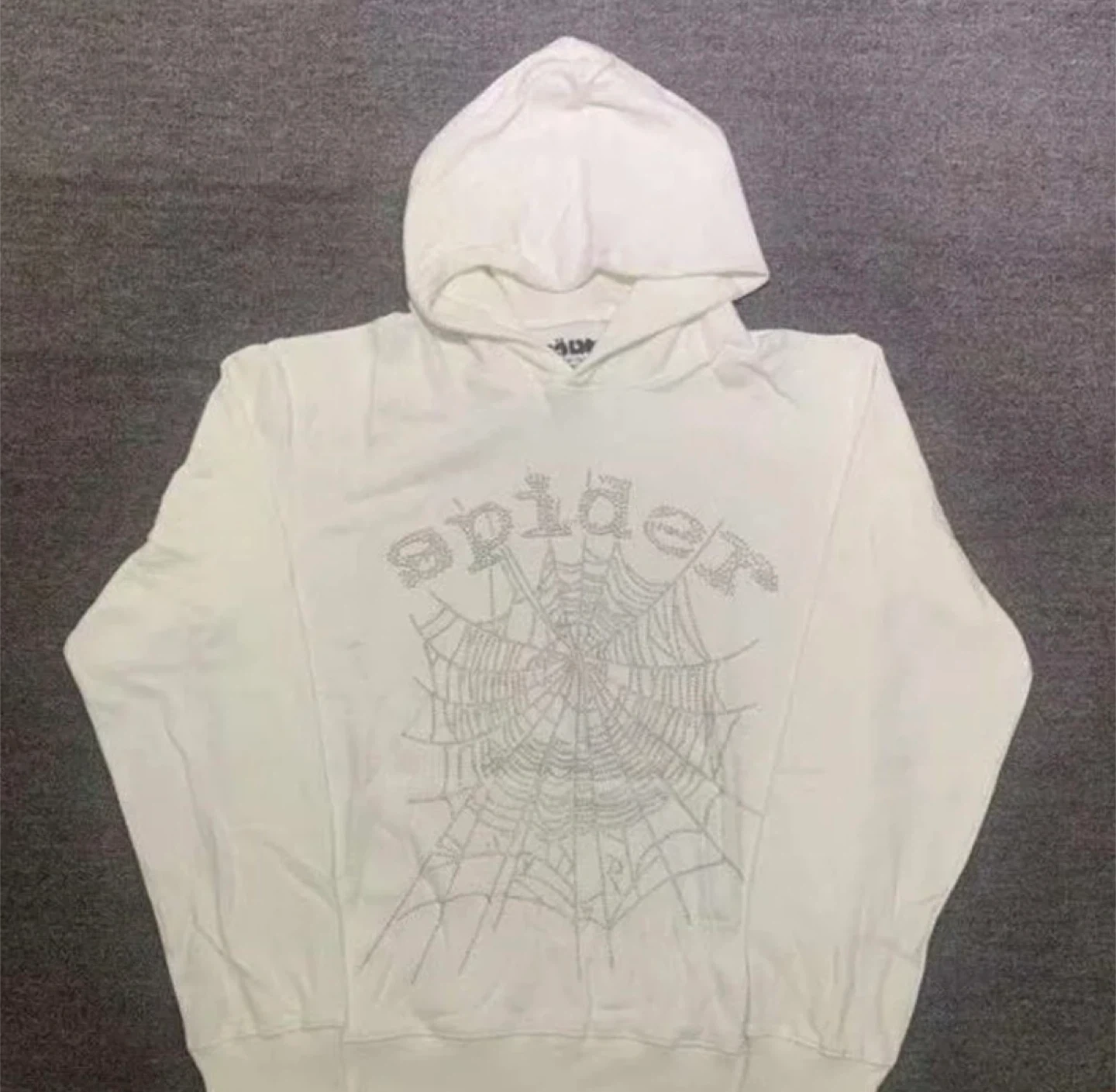 This white hoodie features a sparkly spider web graphic on the front with "spider" in rhinestones. It's a comfortable pullover with a hood and long sleeves. A stylish addition for any streetwear collection!