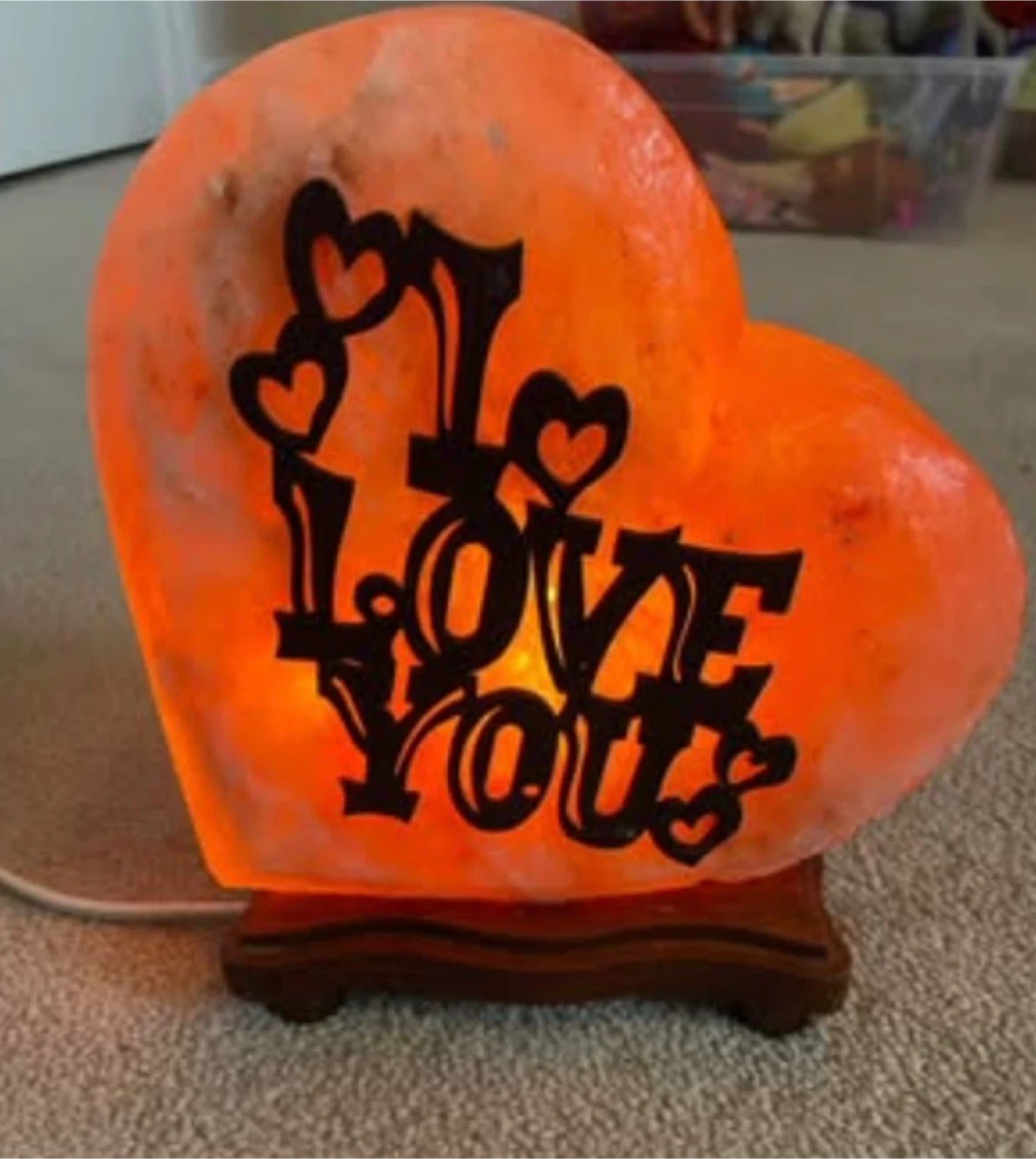 Heart shaped Himalayan salt lamp with "I LOVE YOU" text cutout. It's powered by a corded electric base. Gives off a warm, ambient glow when lit.