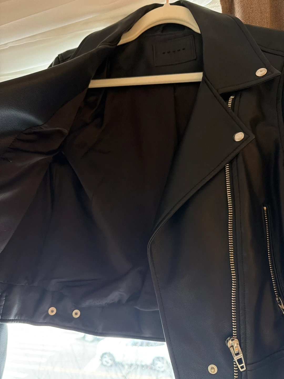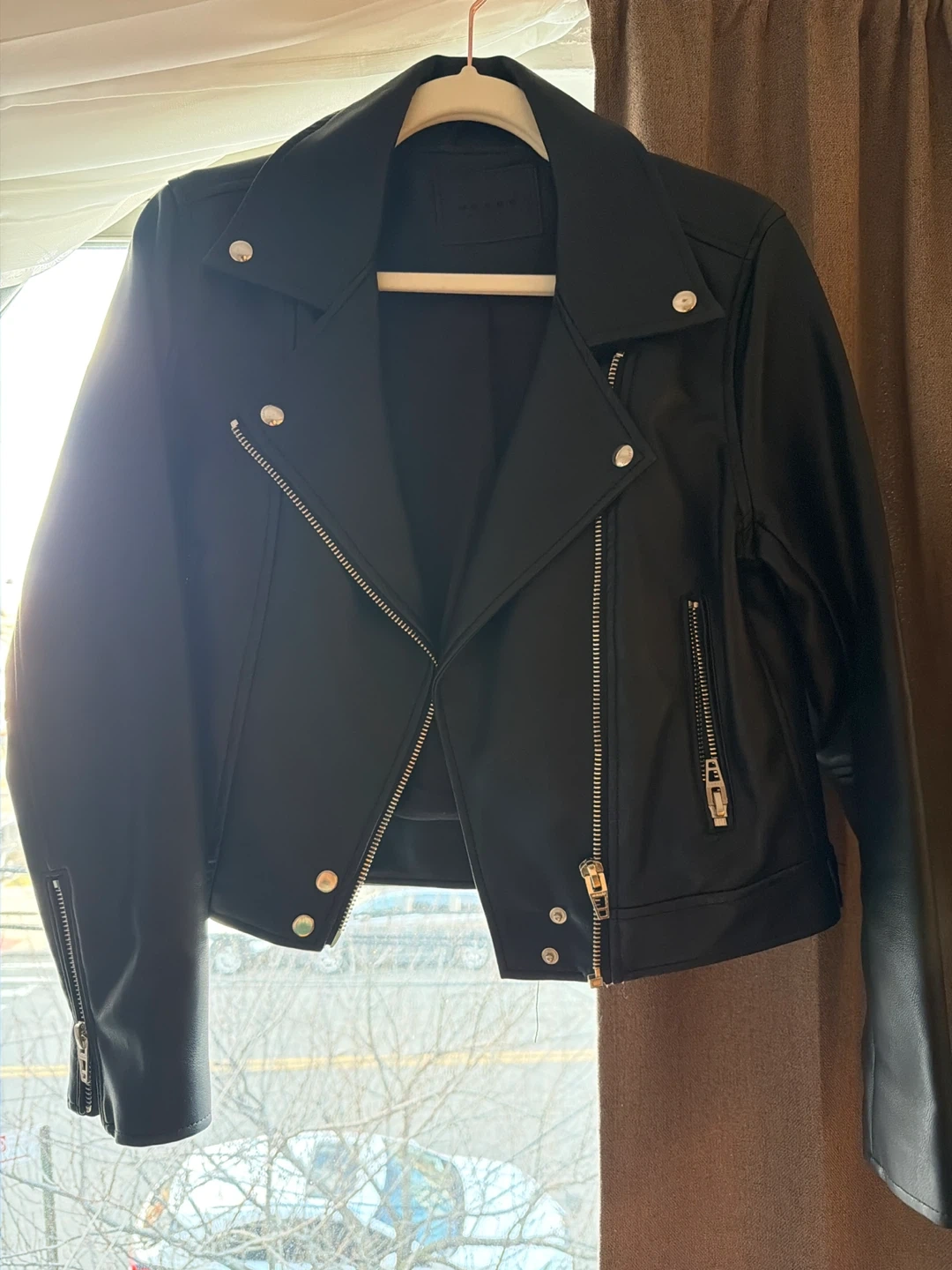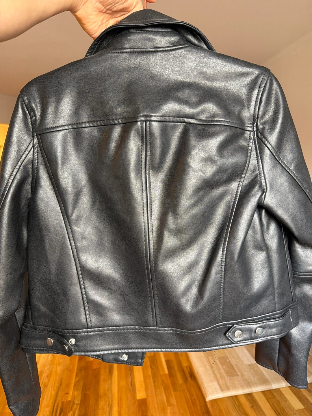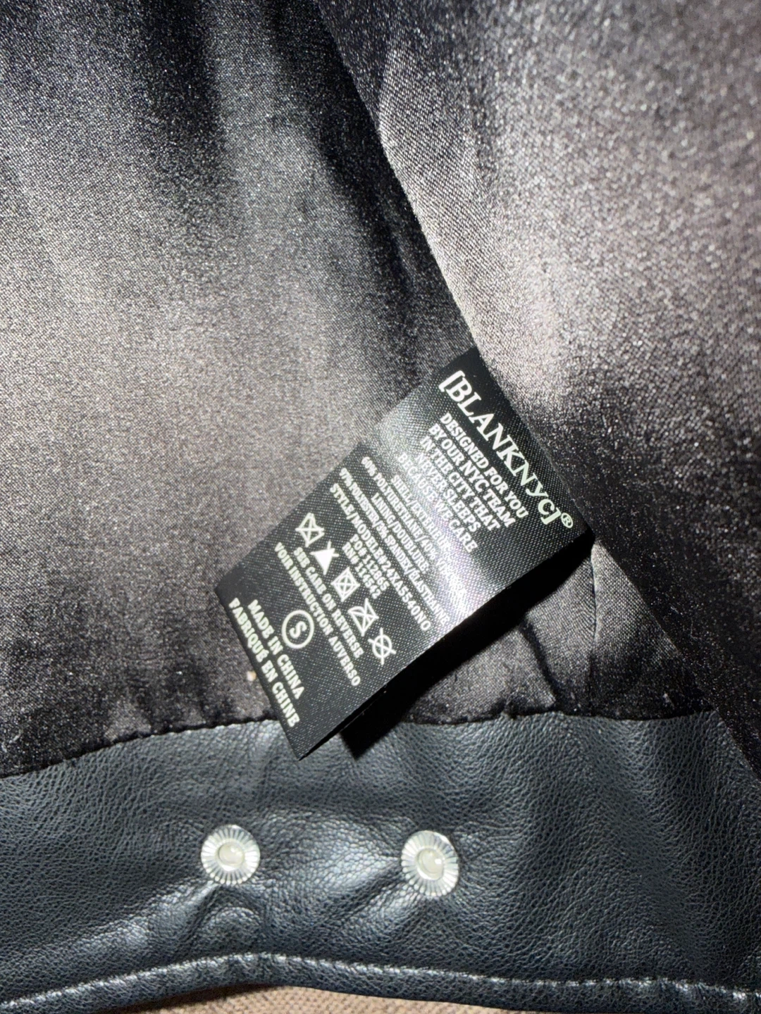Selling a [BLANKNYC] faux leather moto jacket in black. It's a size small and in great condition! The outer shell is made of 60% polyurethane and 40% viscose, while the lining is 100% polyester