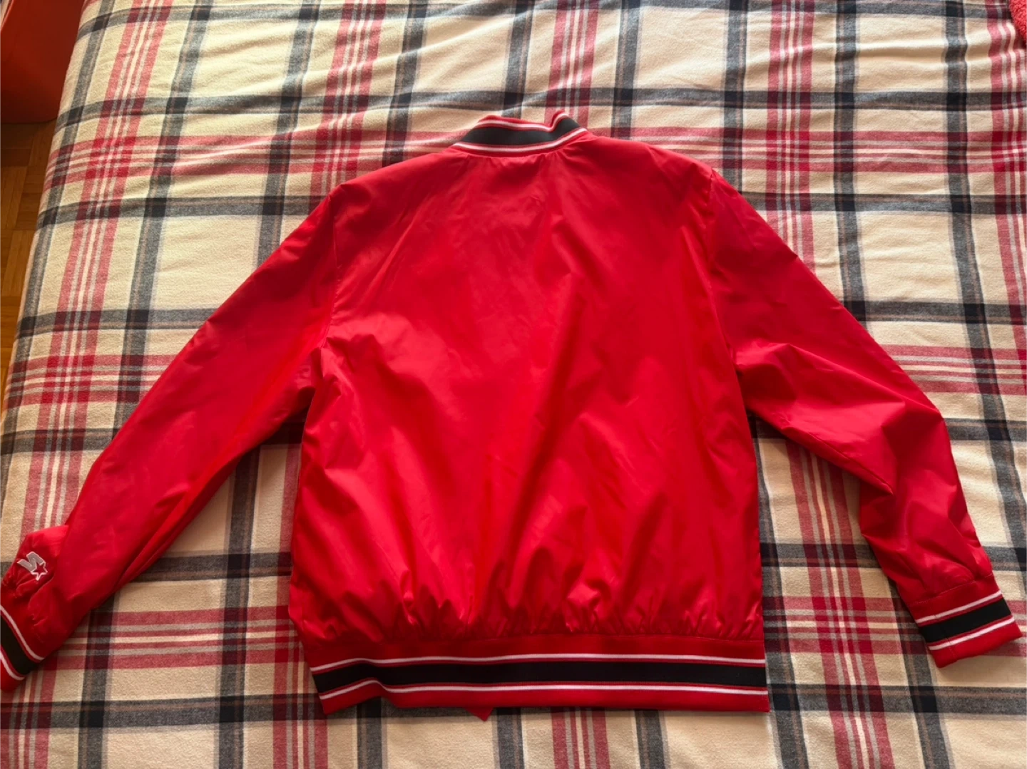 Starter red bomber jacket. It's a classic style with ribbed cuffs and collar. Satin-like material. Has two side pockets.