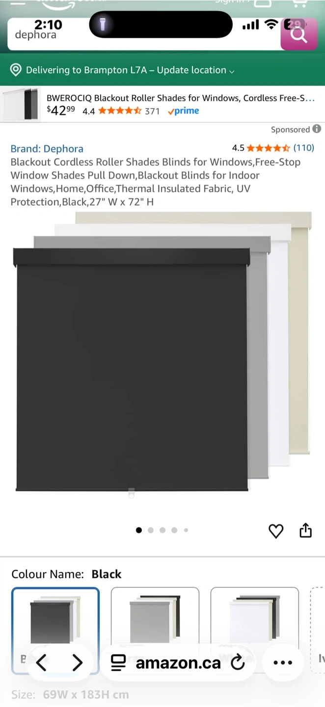 Selling a Dephora Blackout Cordless Roller Shade in black. It's 39 inches wide and 72 inches high. Great for blocking out light and adding privacy to your space! New in box