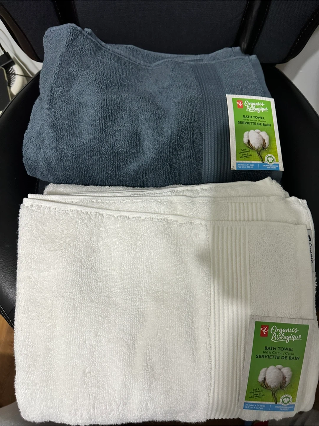 Two PC Organics Biologique bath towels, one in blue and one in white. They're made from 100% cotton. Each towel is 76.2 cm x 137 cm. These would be great for everyday use in any bathroom!