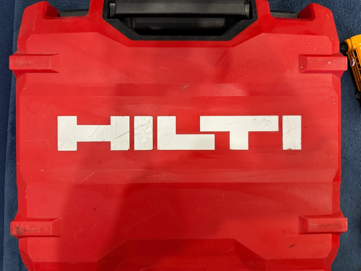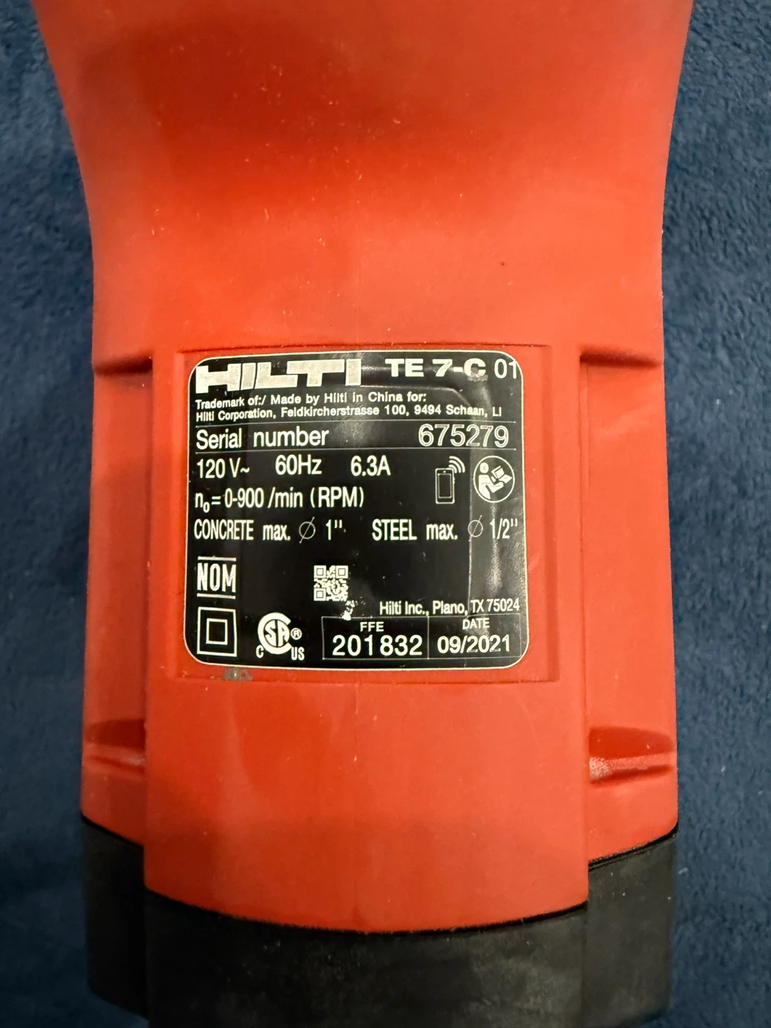 This Hilti TE 7-C rotary hammer drill comes in its original red carrying case. Includes drill bits. Manufactured in September 2021. It's powered by a 120V, 6.3A motor with a variable speed of 0-900 RPM. It can drill up to 1" in concrete and 1/2" in steel.