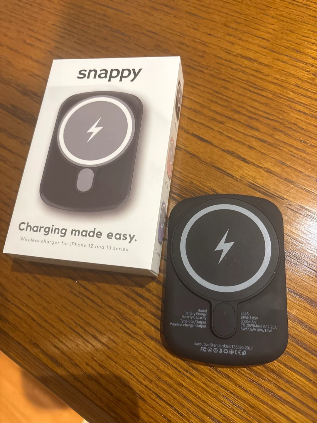 Snappy wireless charger designed for Magsafe series. Battery capacity is 5000mAh. It supports 5W/7.5W/10W/15W wireless charging output. USB-C input/output. Available in black.