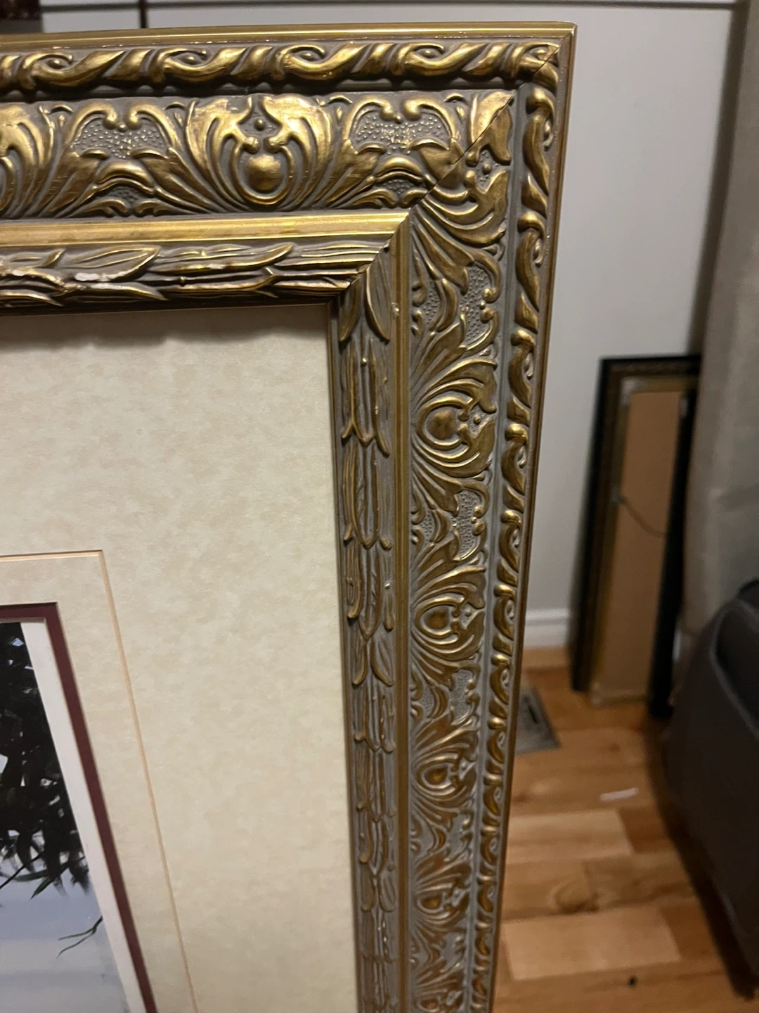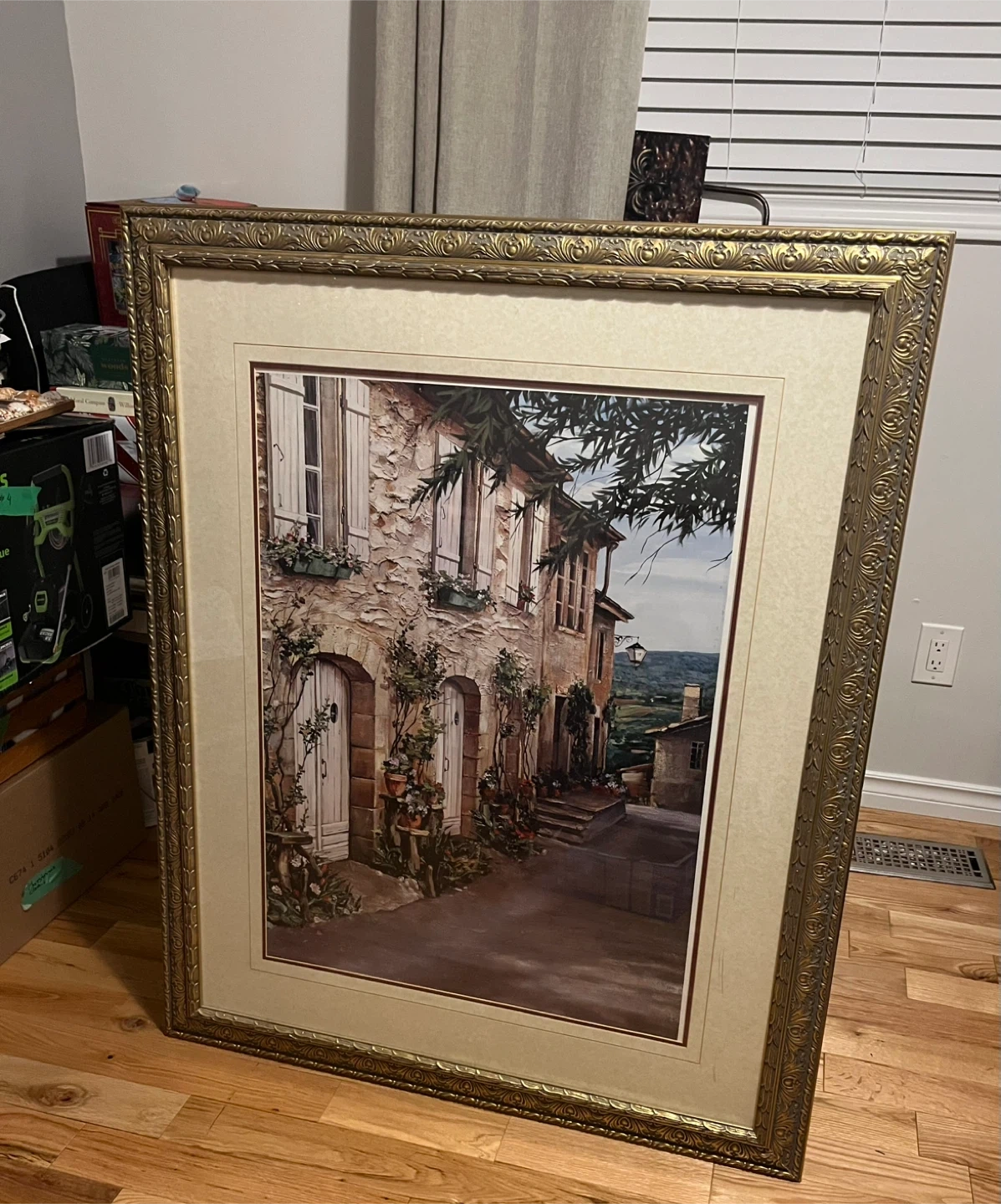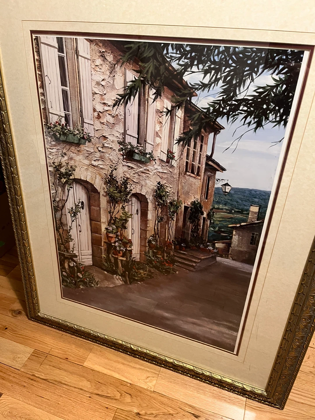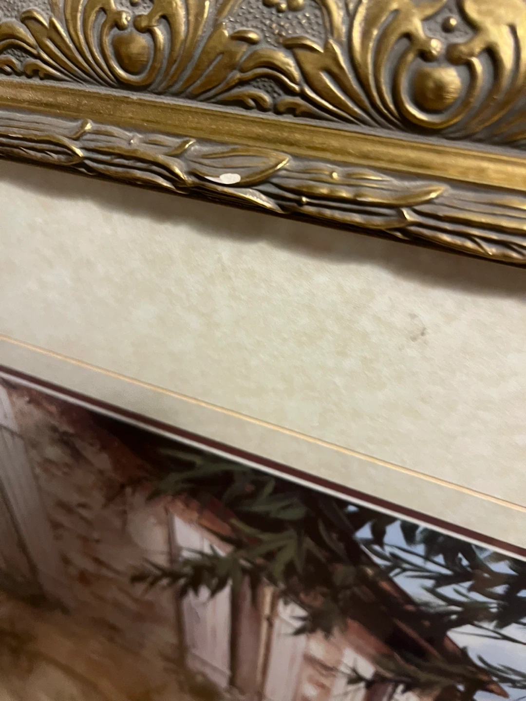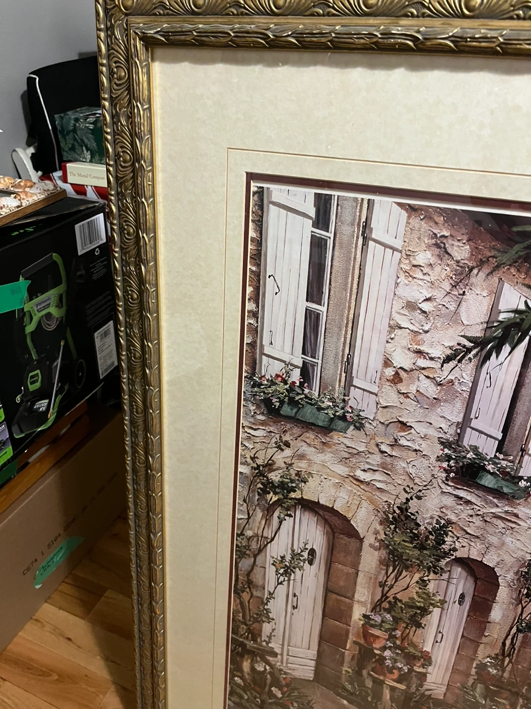 This framed artwork depicts a charming European village scene with stone buildings and shutters. It's housed in an ornate gold-finished frame. Perfect for adding a touch of European flair to your home's decor! It shows some signs of wear as shown in picture