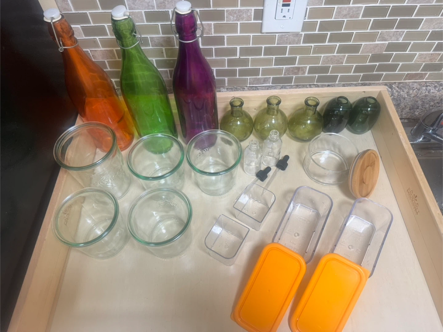 This set includes decorative glass bottles in orange, green, and purple, along with small green glass jars and clear glass jars. You'll also find several small clear containers with orange lids and a glass container with a bamboo lid. Some small glass bottles with droppers are also included. These are great for storage or decorative purposes!