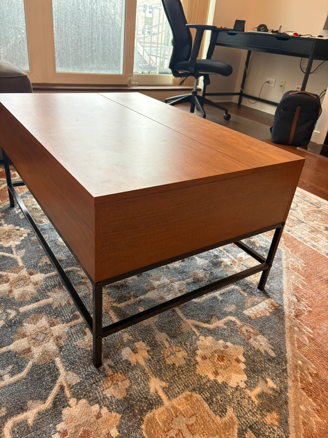 This lift-top coffee table has a sleek, modern design, and a sturdy black metal base. The wood grain veneer is durable, in great shape, with no water spots/stains. It’s also resistant to water spots/stains!