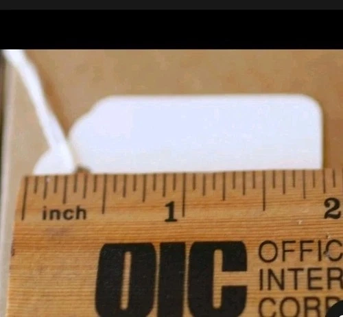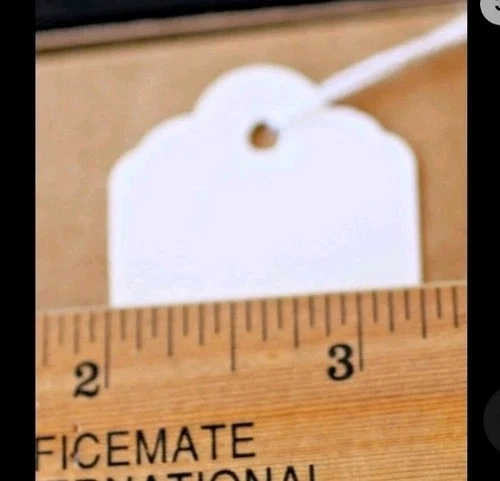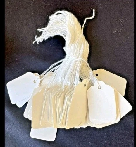 Pack of 1000 size #8 blank white merchandise string tags, designed for retail settings like resale shops. These pre-strung paper tags are ideal for labeling items, especially in a jewelry setting. Each tag measures 2 7/8 x 1 3/4 inches.